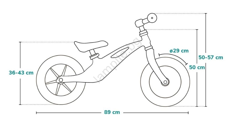 • Регулируеми кормило (50 - 57 см) и седалка (36 - 43 см) гарантират пълно адаптиране към децата до 6 години.