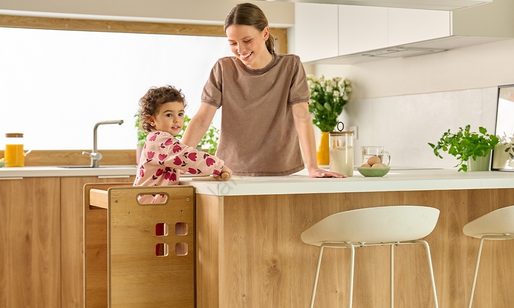 • Позволява на най-малките да бъдат на нивото на работния плот, да виждат всичко, което правите, и да творят директно с вас – така имате и постоянен надзор.