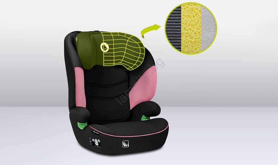 • Подглавникът на детската седалка е подсилен с Memory Foam пяна, която благодарение на своята еластичност ефективно абсорбира ударите.