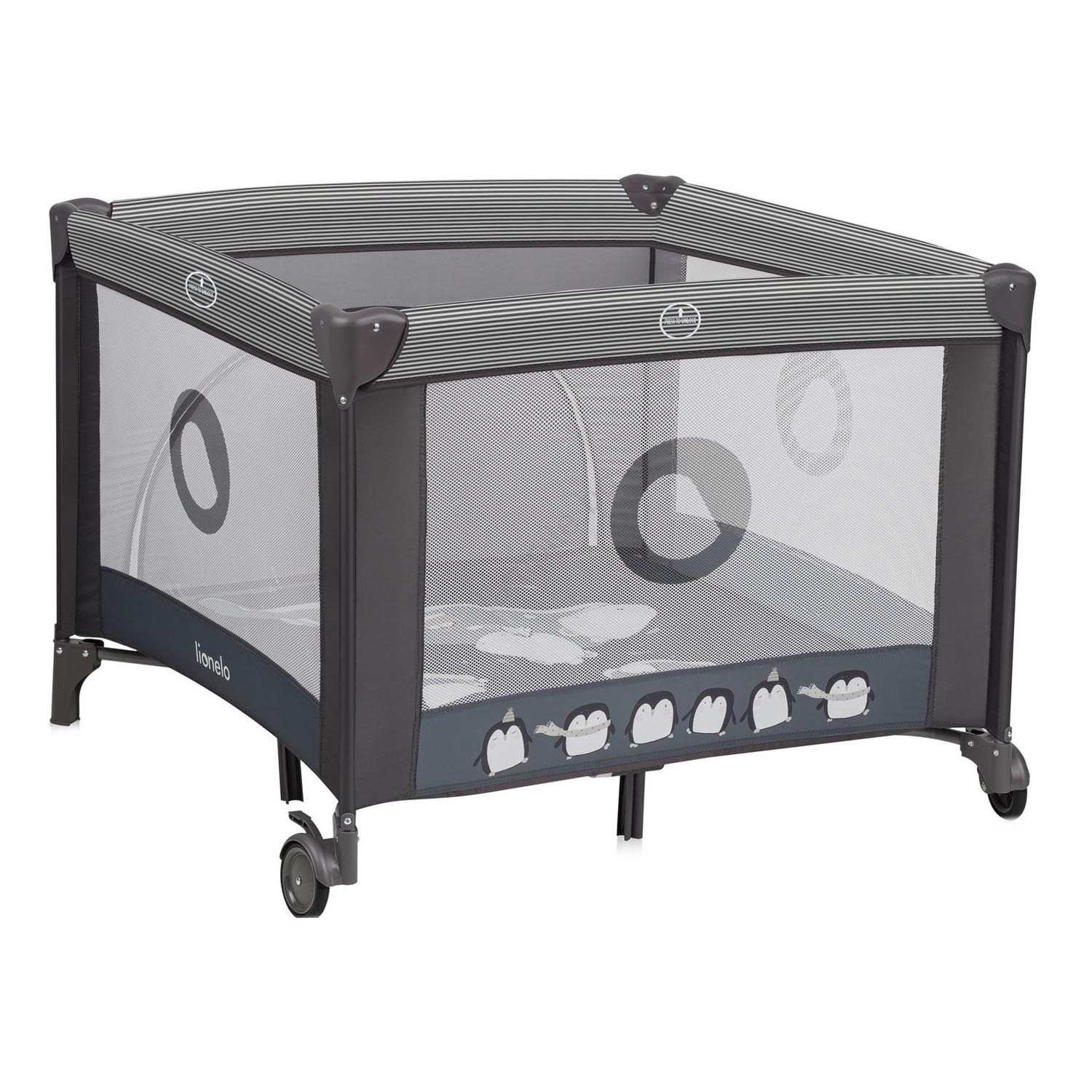 • Двете колела със спирачка позволяват лесно и безопасно преместване на манежа.