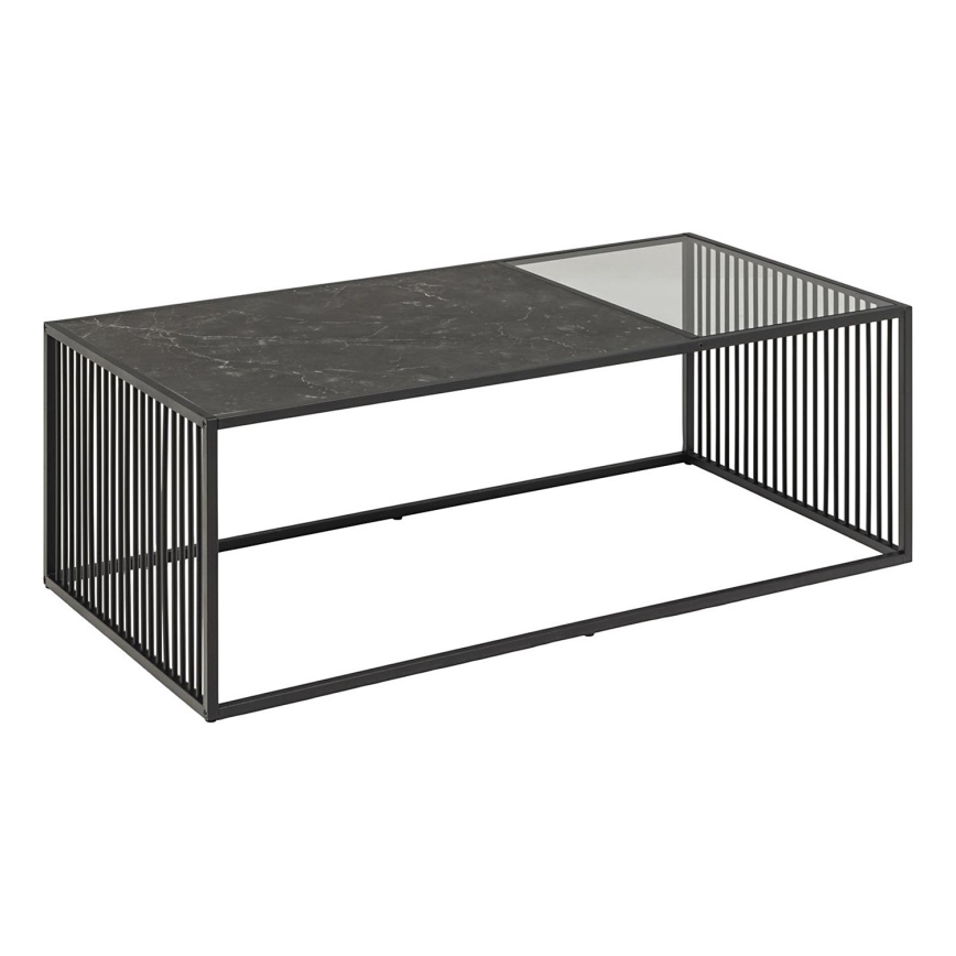 • Горна матово черна Izmir груба меламинова повърхност и димно закалено стъкло, основа матово черна грубо прахово боядисана стомана с отворен рафт.