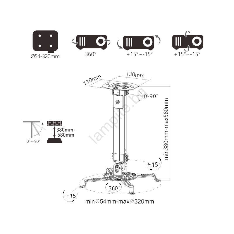 • Регулируема височина за оптимална проекция в диапазона 380 до 580 mm от тавана.
