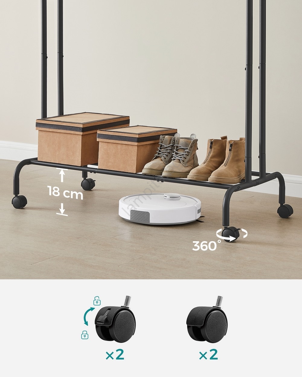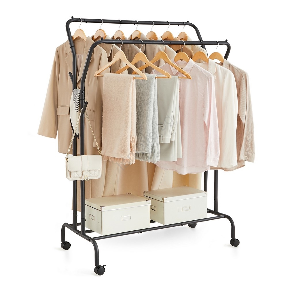 • Благодарение на пръчките за окачване на дрехи с различна дължина, куки от двете страни и долната полица, тази стойка за дрехи организира всички ваши принадлежности на едно място.