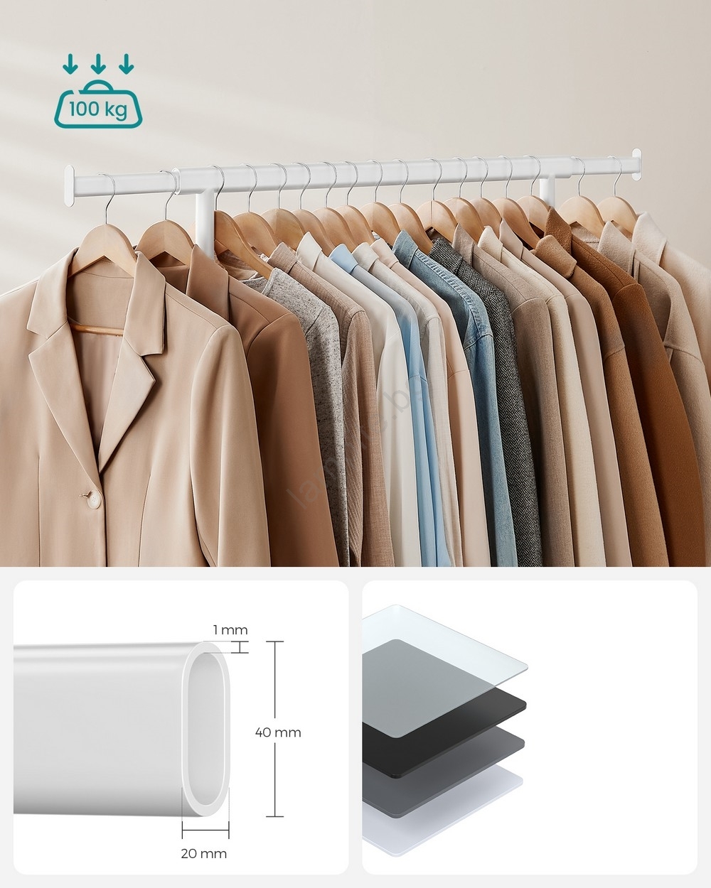 • Горният лост издържа до 100 kg (при равномерно разпределено натоварване) без люлеене или преобръщане, изтеглящият се лост осигурява допълнително място за вашите дрехи, шапки, чанти и др.
