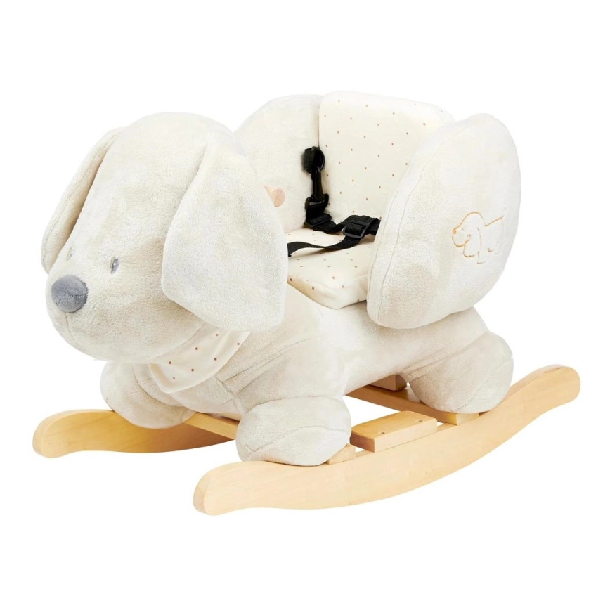 • Плюшена люлееща се играчка с дървена основа и дръжки, която привлича както за люлеене, така и за гушкане.