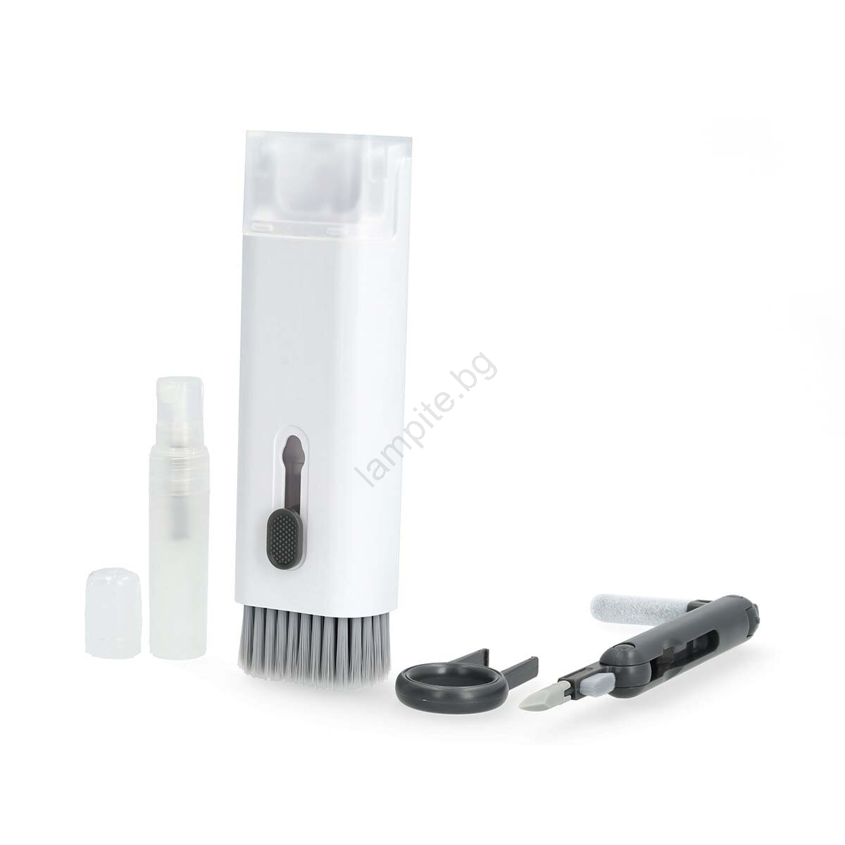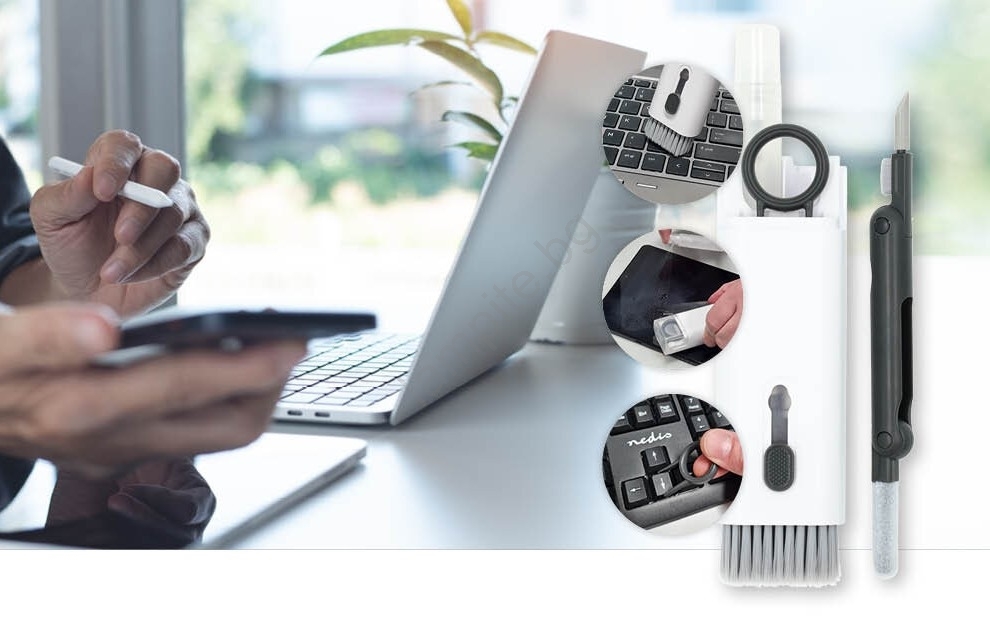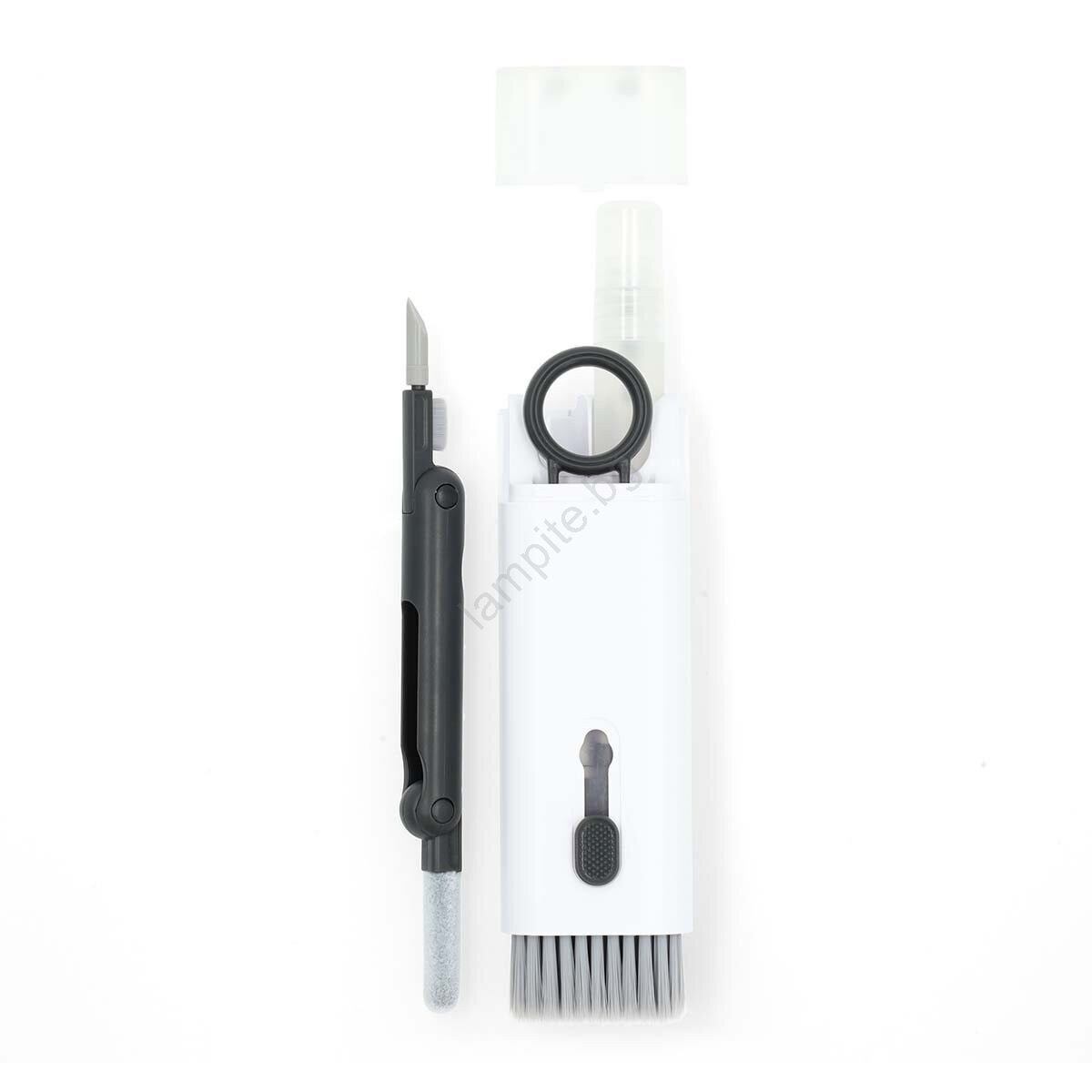 • Съдържа: мини четка, гъба, стъргалка за екран, инструмент за слушалки, голяма четка, бутилка с пулверизатор 5 мл, инструмент за изваждане на клавиши.