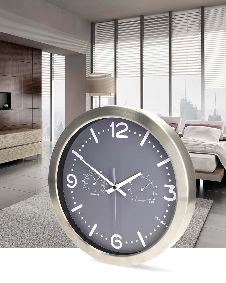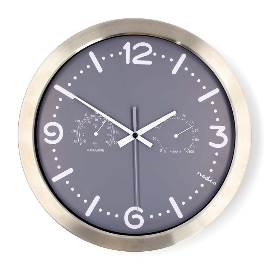 Стенен часовник с термометър и влагомер, Ø 30,5 см, 1xAA, корпус от неръждаема стомана/сива