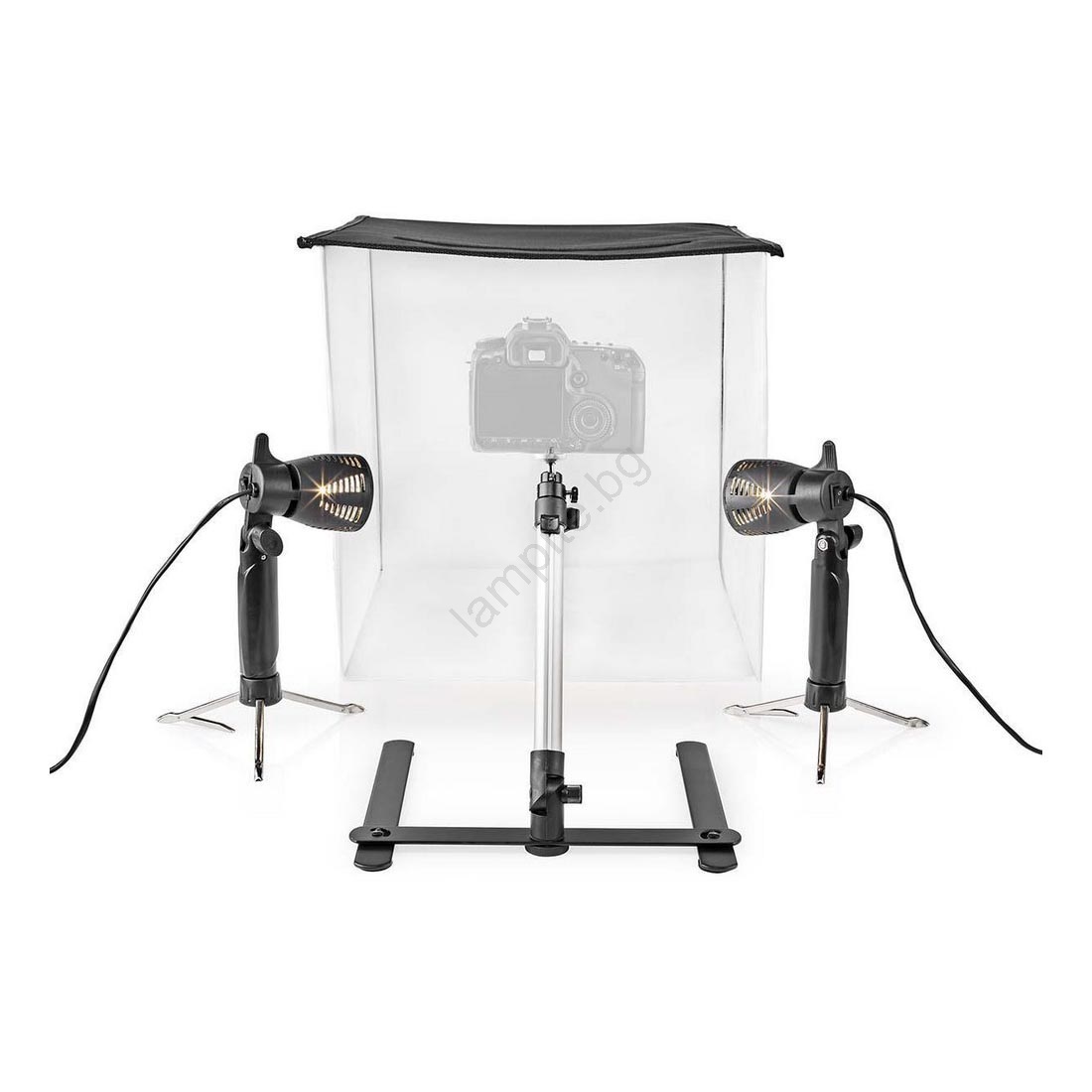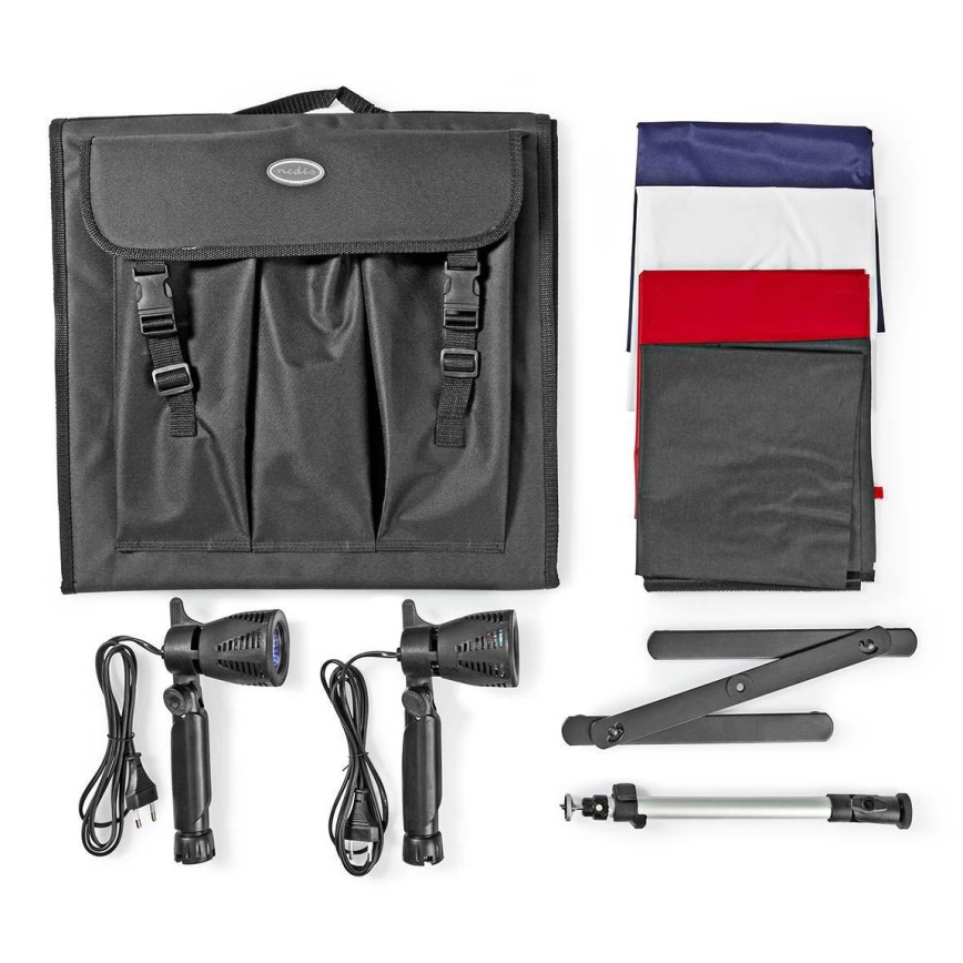 • В комплекта: 2x LED крушка, статив за фотоапарат, 4x цвят на фона (черен, червен, бял и син) и чанта.