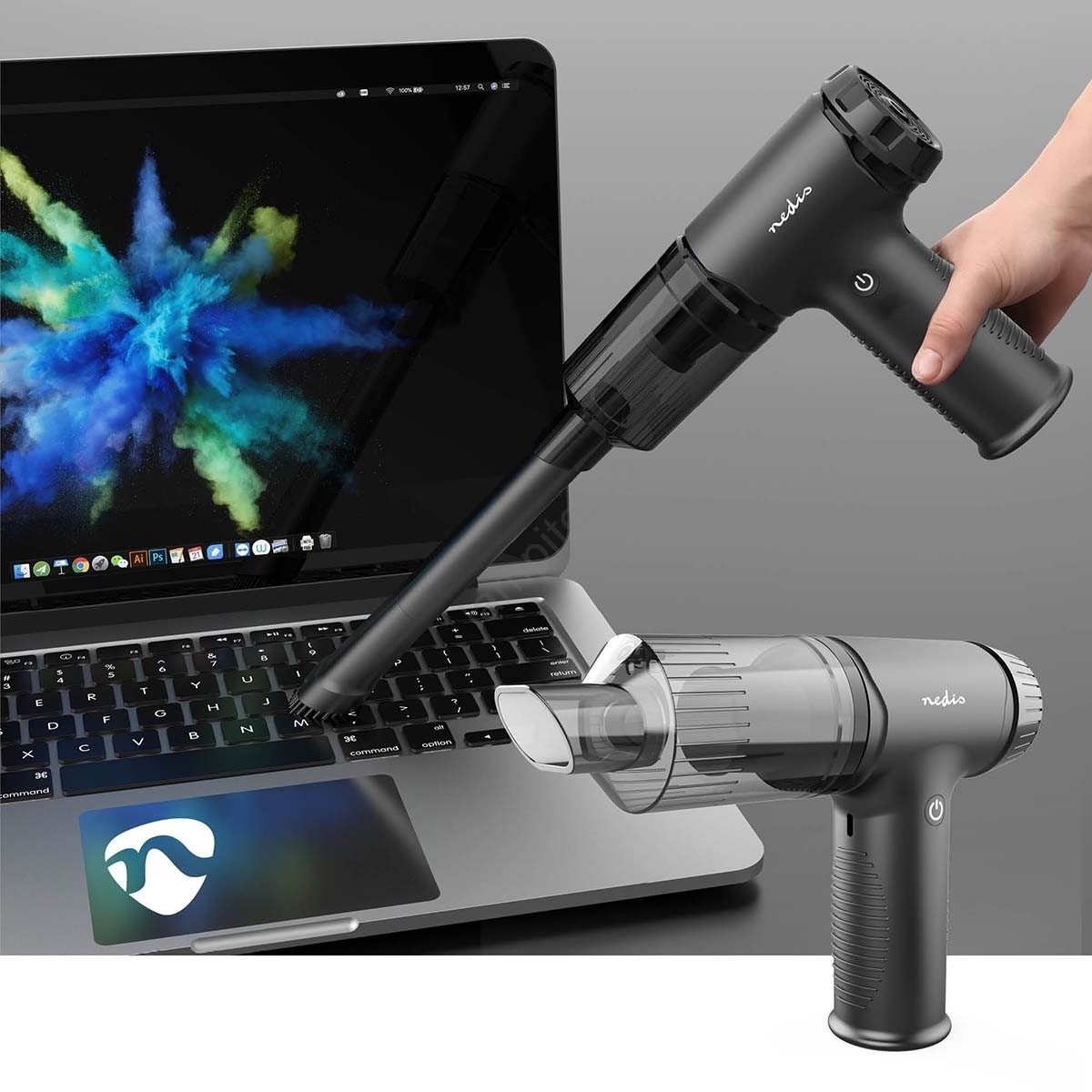 • Съдържание на опаковката: многофункционална прахосмукачка, дълъг всмукателен накрайник, четков всмукателен накрайник, 2x накрайник за духане на прах, дълъг плосък накрайник за духане, накрайник за надуване, накрайник за сгъстен въздух, USB-C кабел.