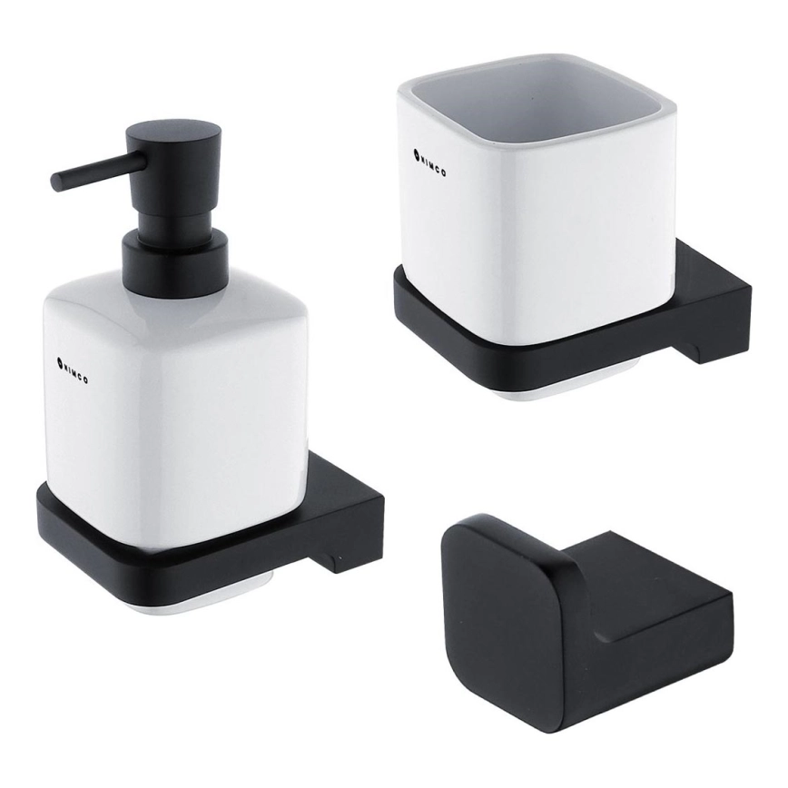 NIMCO MAC комплект-31K-T-90 - Стенен дозатор за сапун, поставка за четки за зъби и закачалка MAYA 320 мм бял/матов черен
