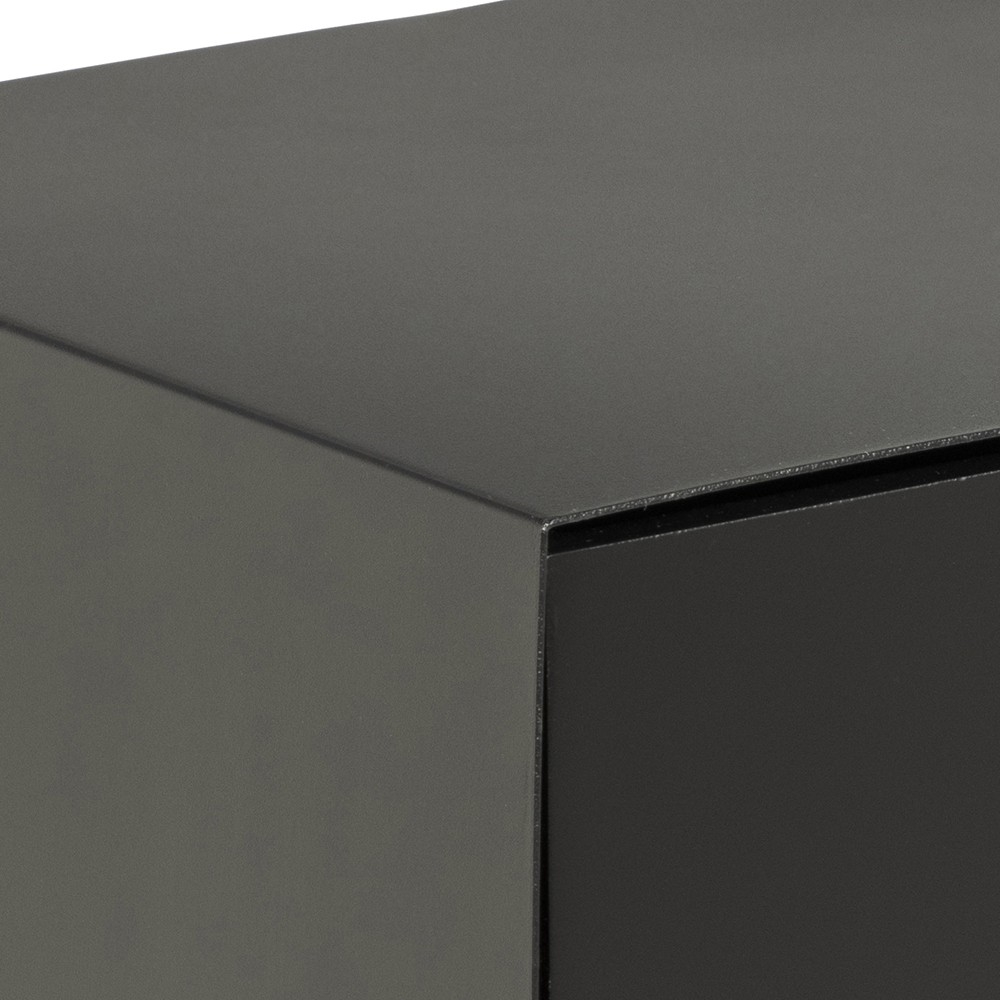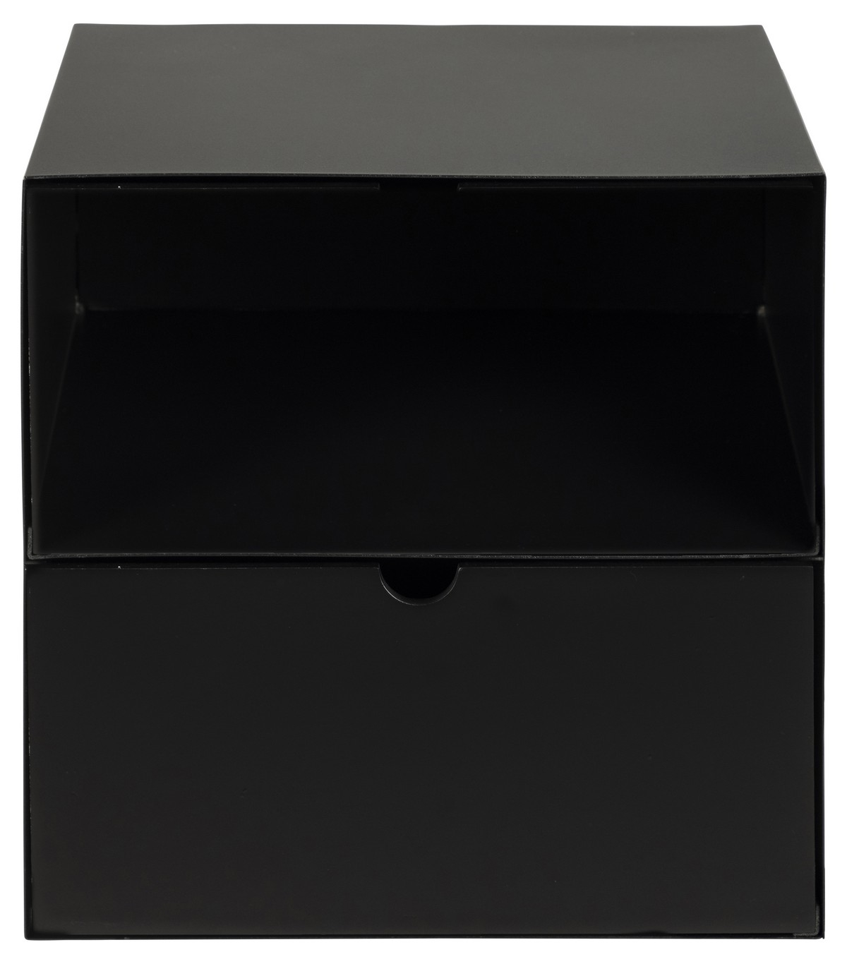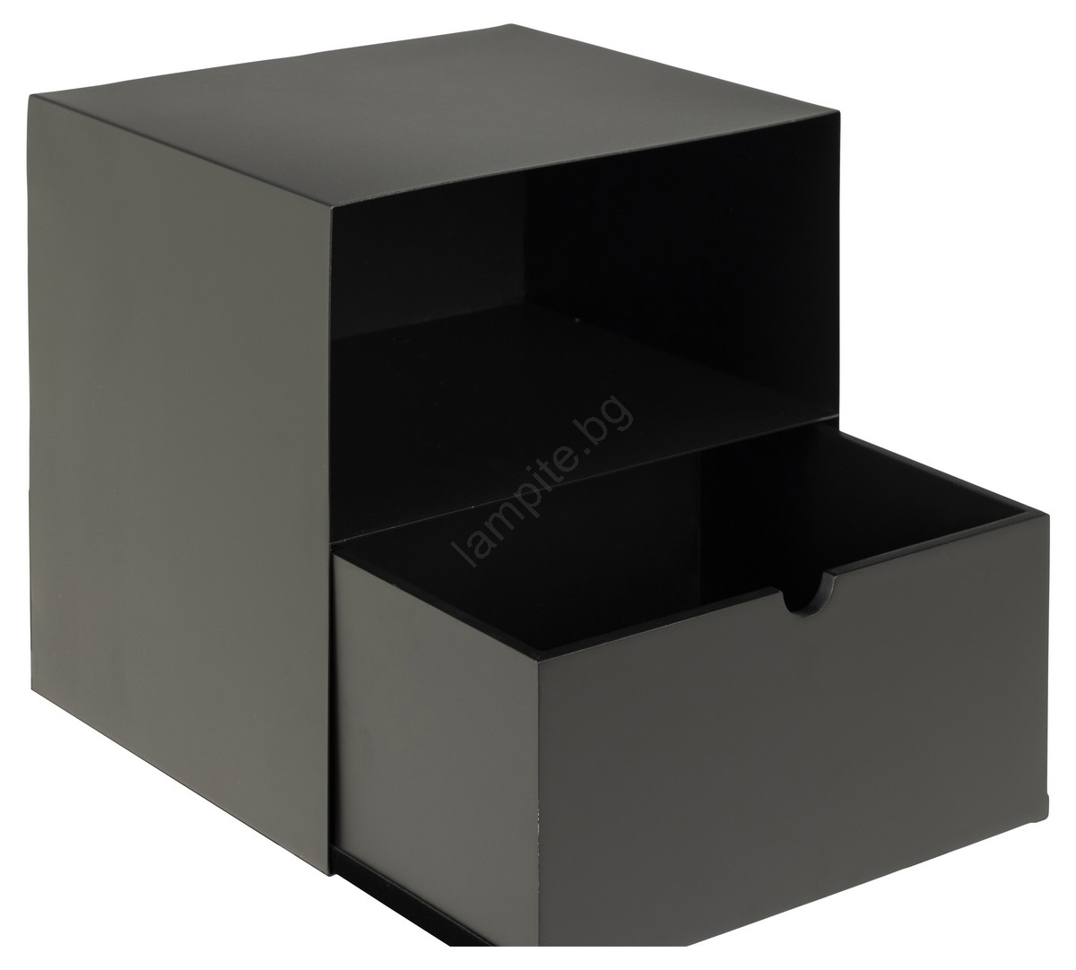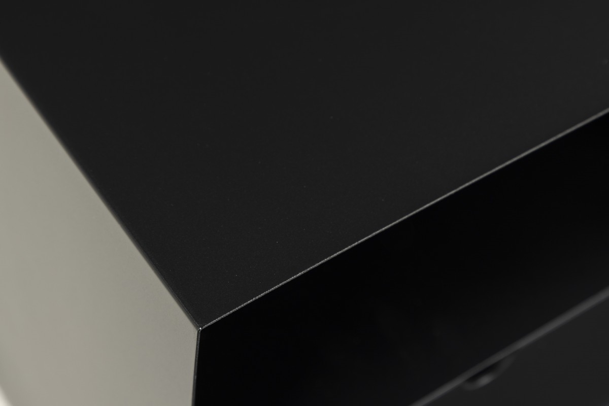 • Горният плот и рамката са от матово черна стомана с грубо прахово покритие, чекмеджето е черно с отворено отделение и възможност за стенен монтаж.