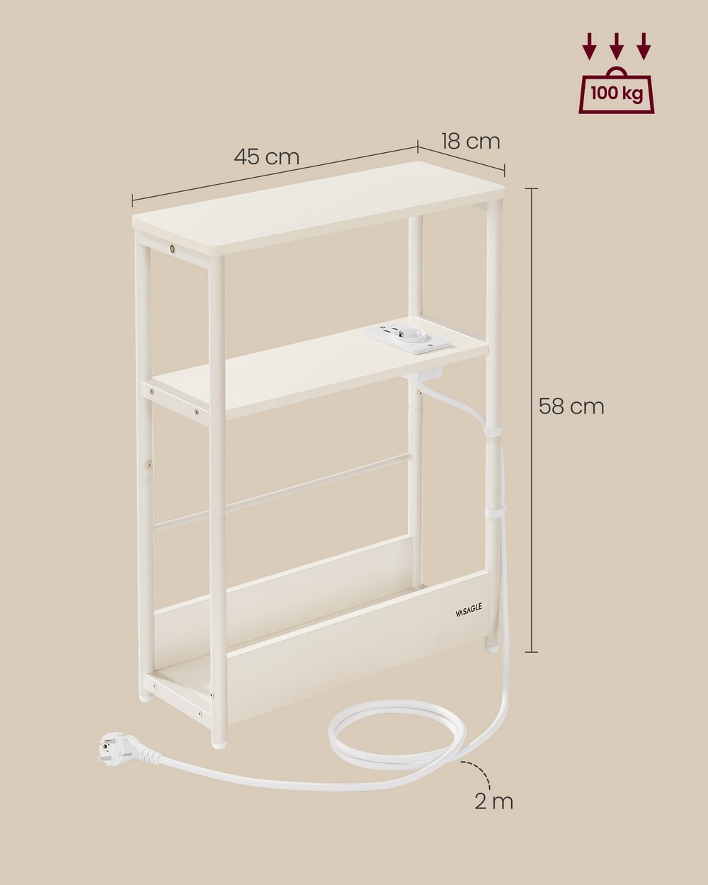 • Благодарение на тънкия си силует заема малко място на пода, като същевременно предлага достатъчно място за съхранение благодарение на 2 рафта.