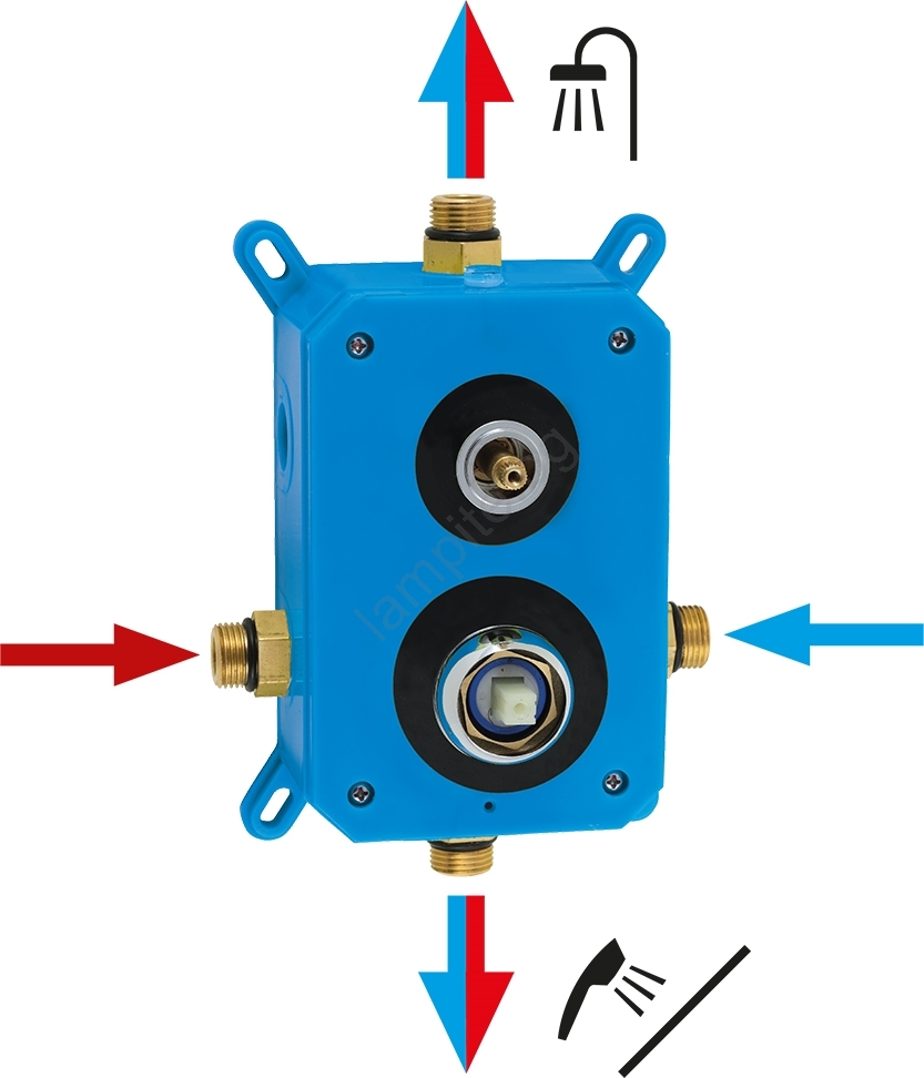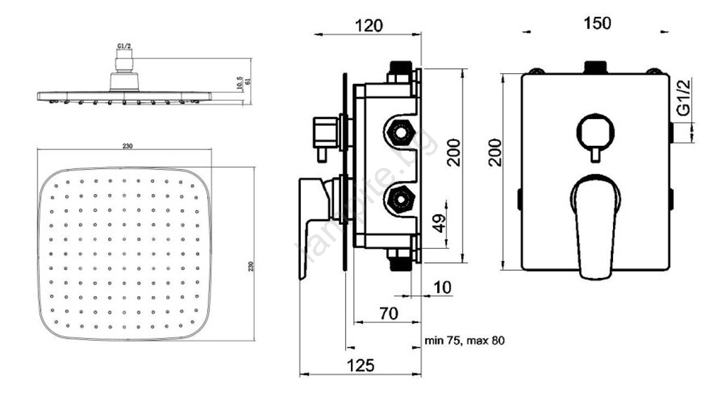 • Комплектът включва: вграден смесител с патрон, ръчен душ с 3 позиции, квадратен стенен извод с държач за ръчен душ, метален душ маркуч с антиусукваща защита, душ глава с рамо.