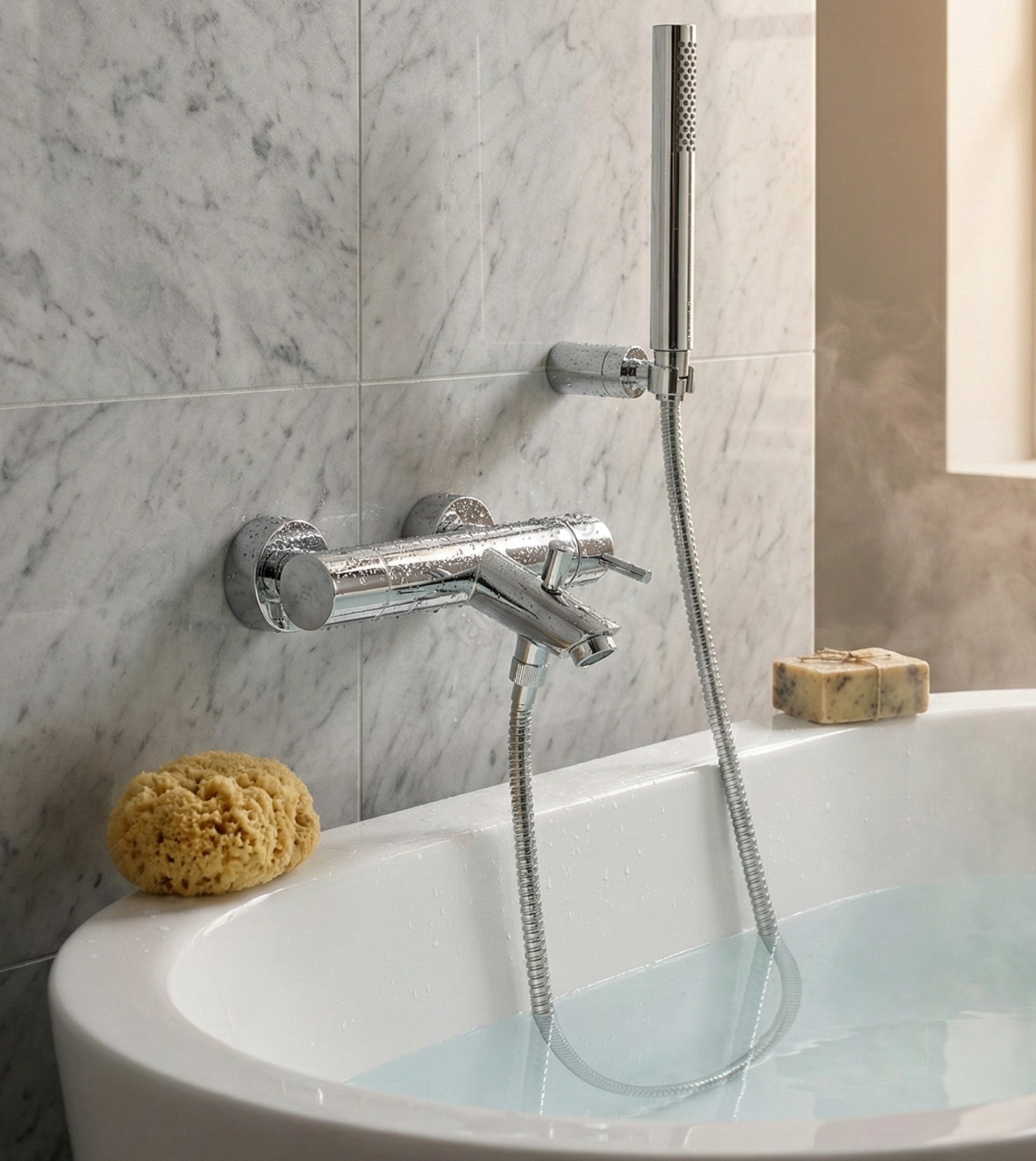 • Термостатен стенен смесител за вана с душ комплект.