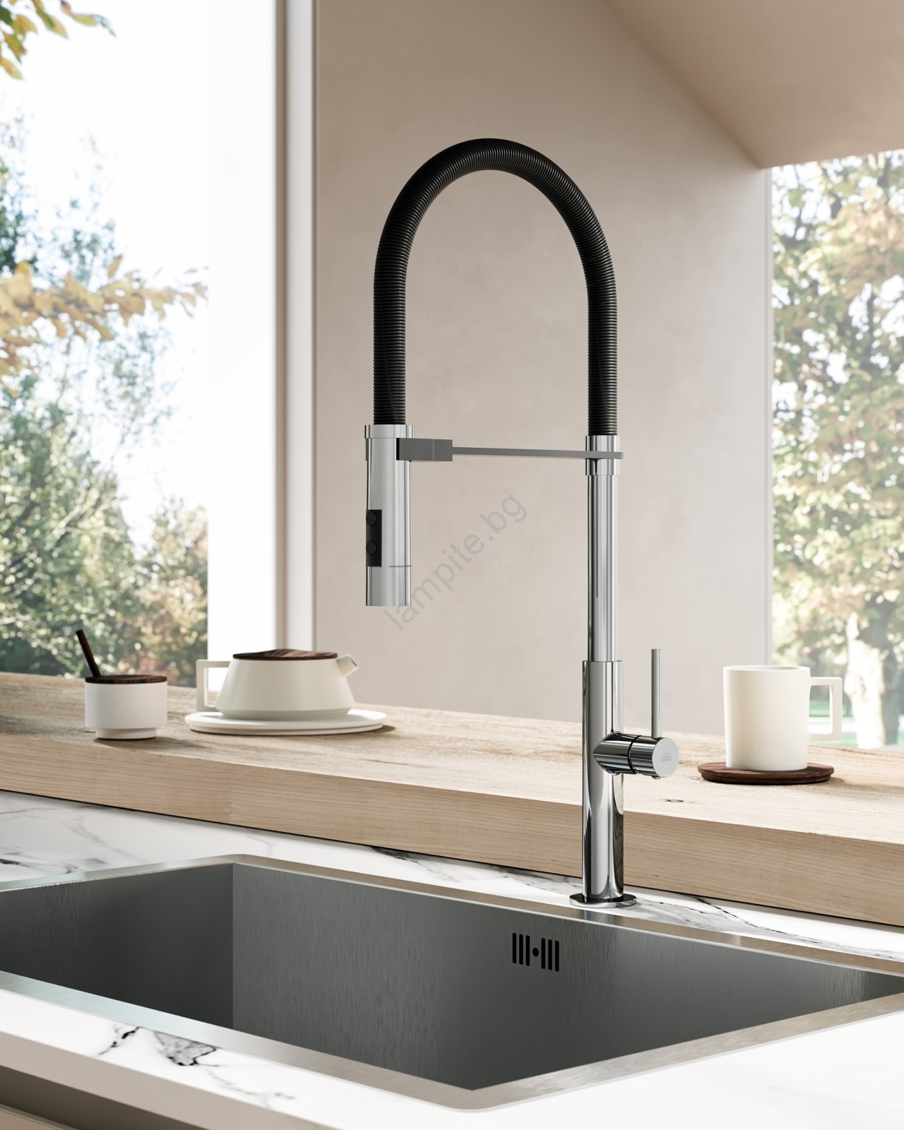 • Изтегляща се лейка улеснява изплакването на мивката, зеленчуците и по-големи тенджери.