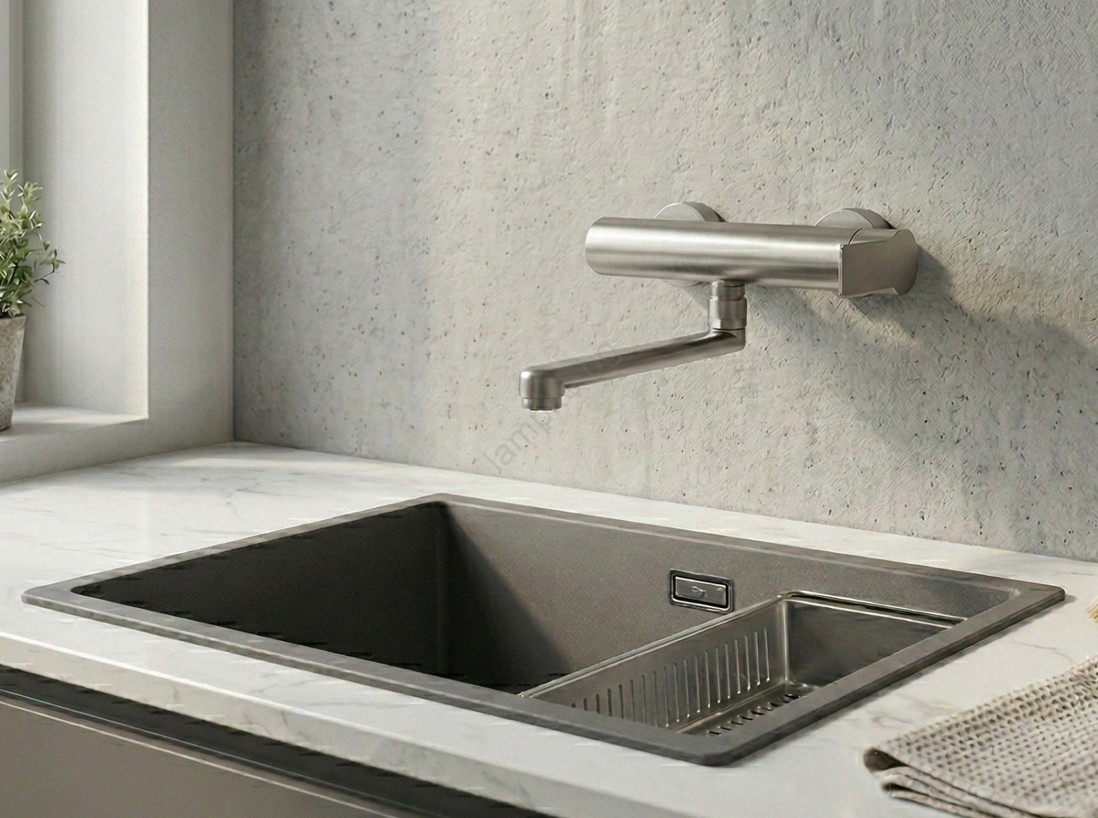 • Кухненски стенен смесител от неръждаема стомана.