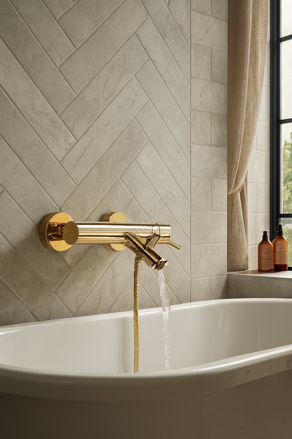 • Стенно монтиран едноръкохватков смесител за вана с елегантно златно покритие.