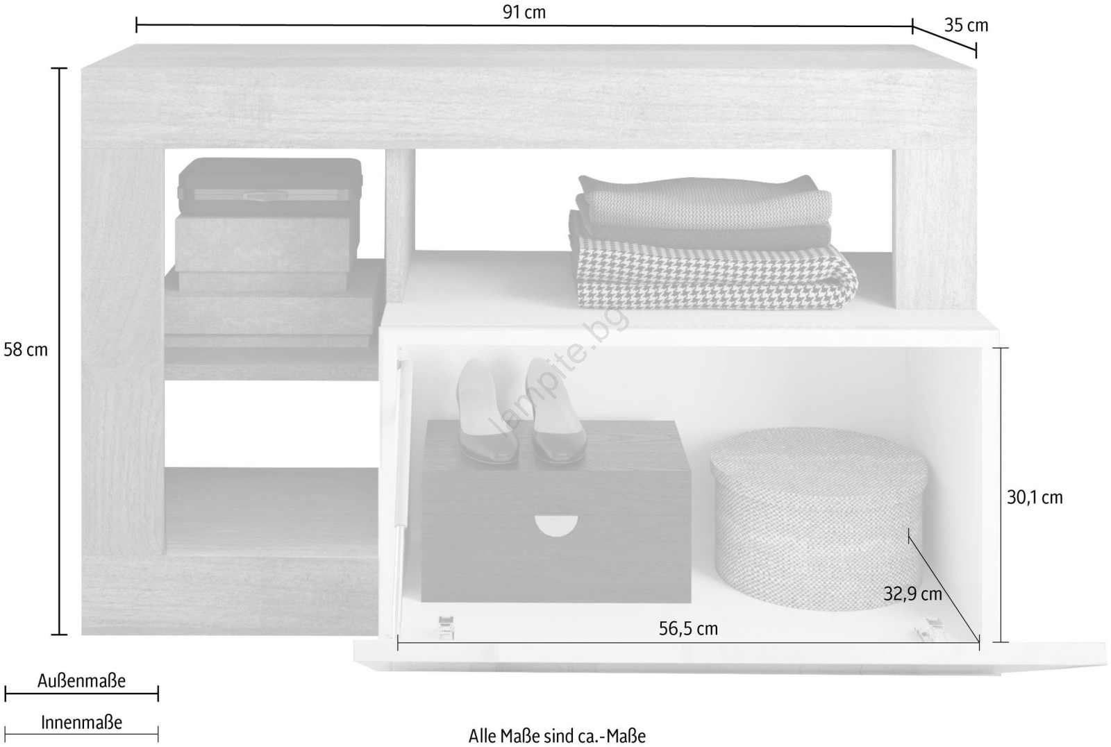 • Разполага с 3 открити полици и вътрешна полица с повдигащ се капак за съхранение на чанти, обувки и сезонни вещи.
