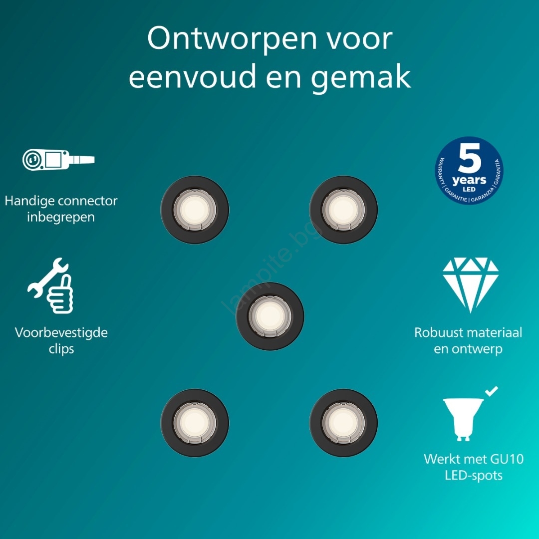 Philips - Комплект от 5 вградени таванни осветителни тела PERIDOT 1xGU10/7W/230V черни се отличава с приятен и функционален дизайн.  Подходяща е крушка с цокъл GU10. Тук можете да закупите и други крушки на изгодни цени. Ще имате интересно допълнение към дома си.