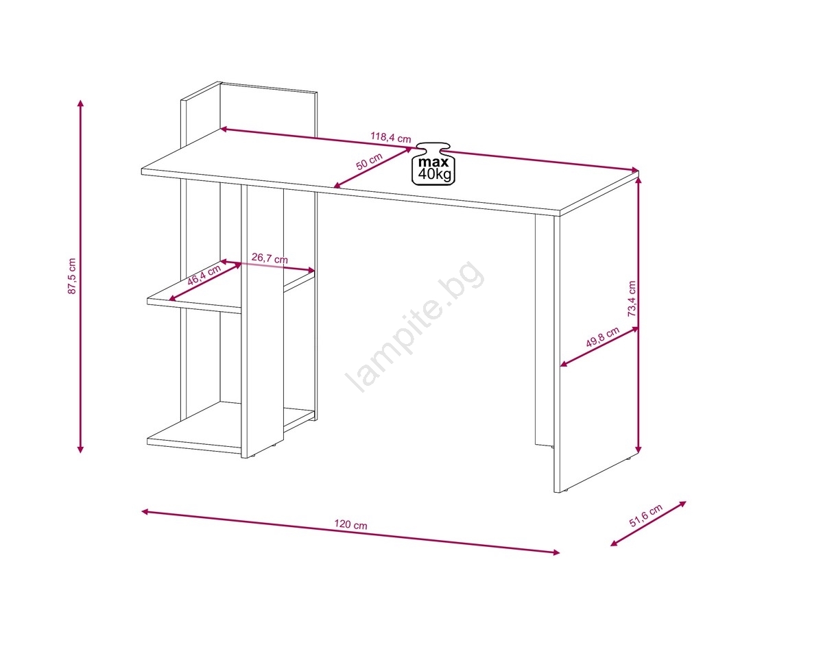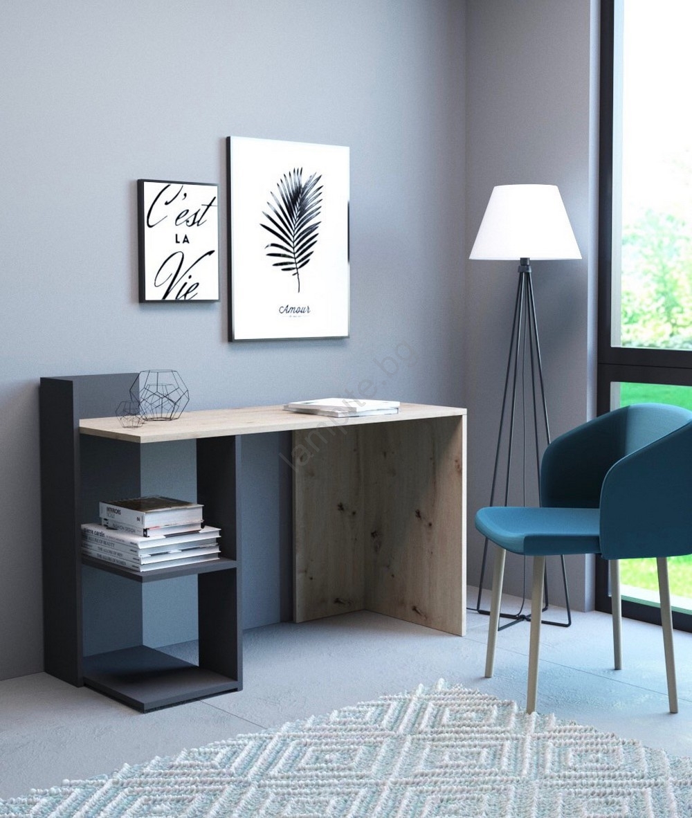 • Правоъгълната работна повърхност е подпирана от странична полица с две открити рафтове, идеални за съхранение на книги, канцеларски принадлежности или декорации.