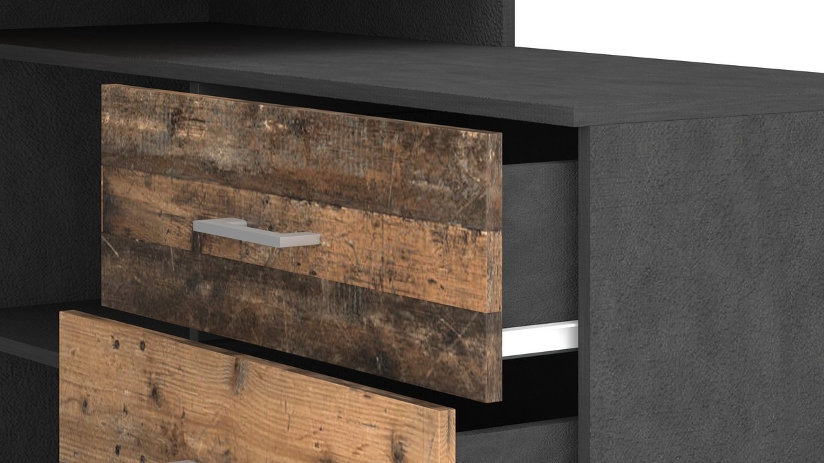 • Осигурява просторна работна повърхност, две открити рафтове за книги или аксесоари и три чекмеджета за по-добра организация на вашето пространство.