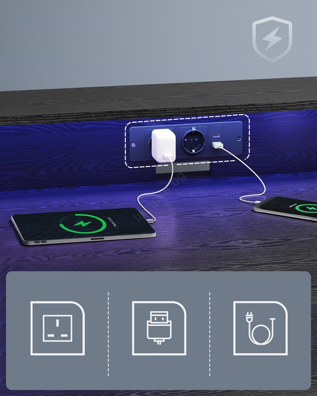 • Практическият вграден удължител на бюрото е оборудван с 2 контакта и 2 USB порта, за свързване на няколко устройства едновременно.