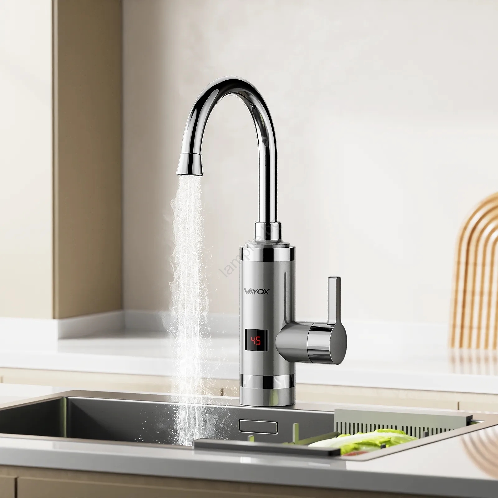 • Цифровият LCD дисплей показва изходната температура на водата.