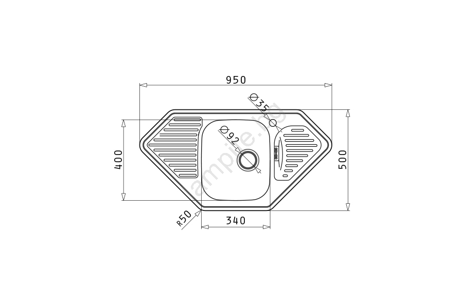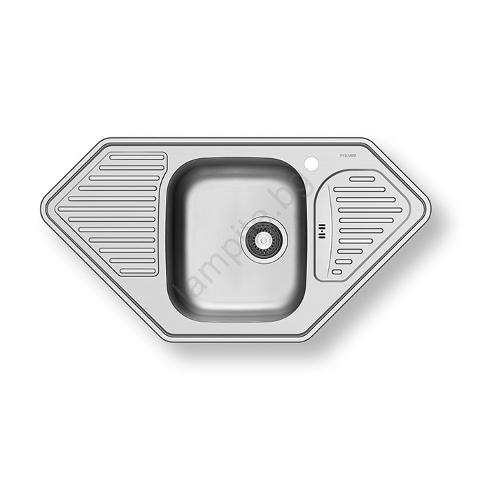 • Ъглова мивка от неръждаема стомана с един отвор за смесител и две отцедни площи.