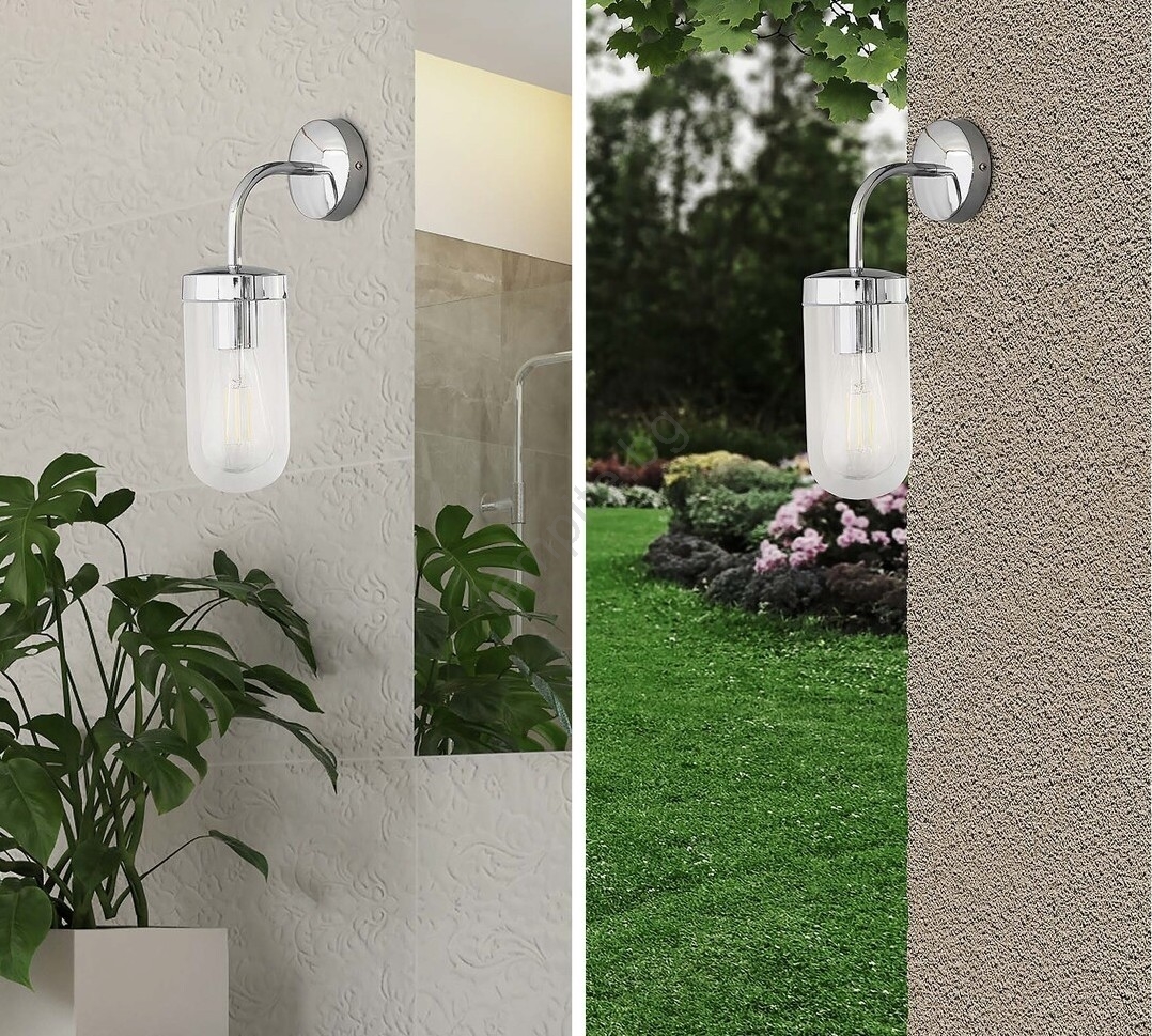 Модерно осветително тяло за баня Yago препоръчваме основно за монтаж над огледалото, допълващо мивката, но може да бъде поставено и на тераса или на всяко друго външно стенно пространство на къщата. Този модел, състоящ се от алуминиево осветително тяло в черен цвят и цилиндричен абажур от прозрачно стъкло, може да се използва с една крушка с мощност до 60 W. Типът на фасунгата е E27. Осветителното тяло Yago може да се закрепи на стената с помощта на кръгла декоративна основа в черен цвят. Класът на защита IP44 осигурява защита срещу проникване на предмети с диаметър до 1 мм и срещу пръскаща вода от всякаква посока. Размерите на това стенен осветителен уред за баня са: ширина 97 мм, височина 325 мм, разстояние от стената 170 мм, монтажен диаметър 90 мм. Този модел се доставя без източник на светлина.