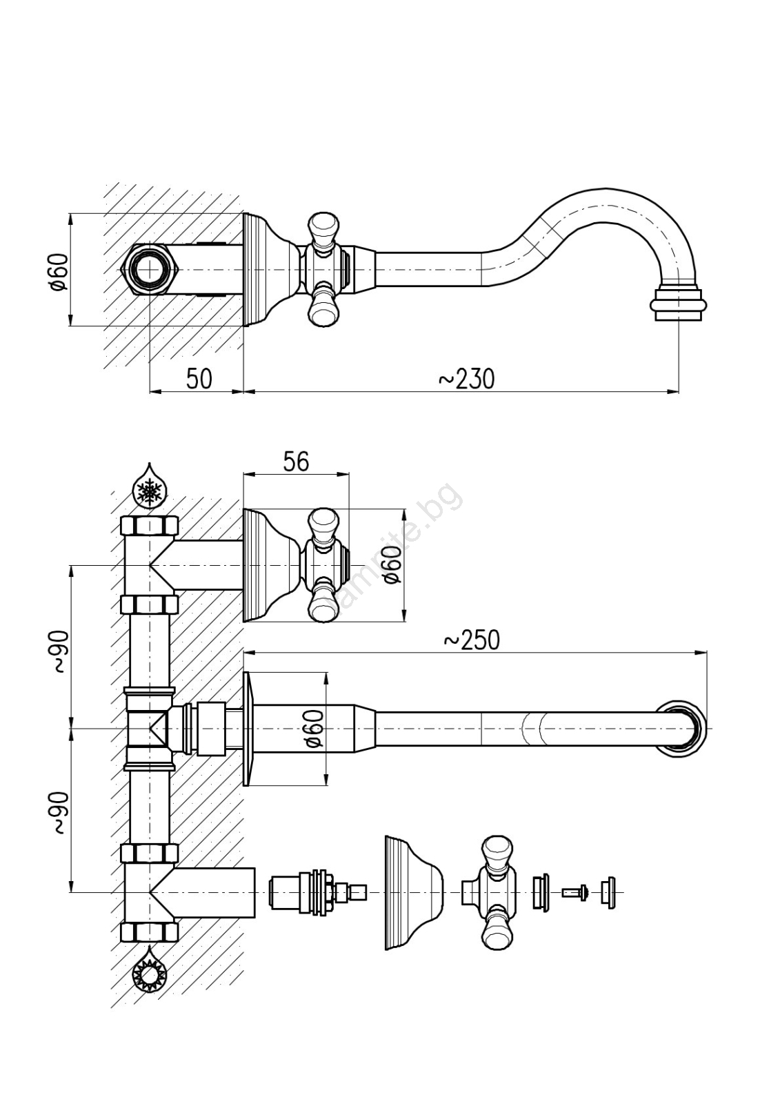 • Смесителят е снабден с керамичен патрон 1/2".