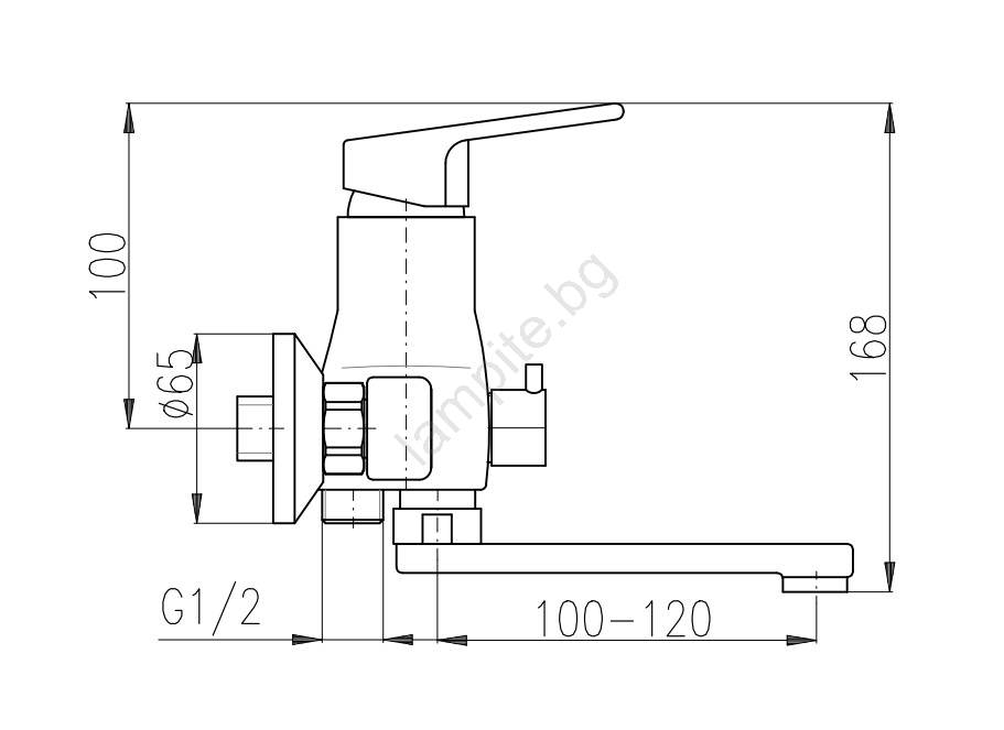 • Стенно монтиран смесител за вана с плосък въртящ се чучур.