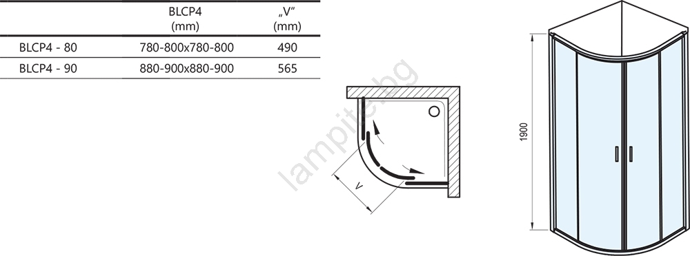 • Монтира се в облицован ъгъл на банята върху поддони Ravak Ronda, Elipso, Elipso Pro, Elipso Pro Flat, Elipso Pro Chrome или директно на пода с вграден отводнителен канал или подов сифон.