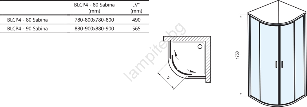 • Кабината с височина 175 см се монтира в облицован ъгъл на банята върху дълбока поддушова вана Sabina.