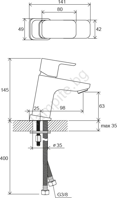 • Батерията се доставя без изпускател и включва гъвкави присъединителни маркучи с дължина 450 мм и присъединител G3/8.