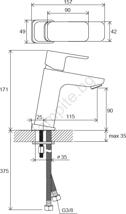 • Смесителят се доставя без изпускател и включва гъвкави свързващи маркучи с дължина 400 mm и диаметър G3/8.