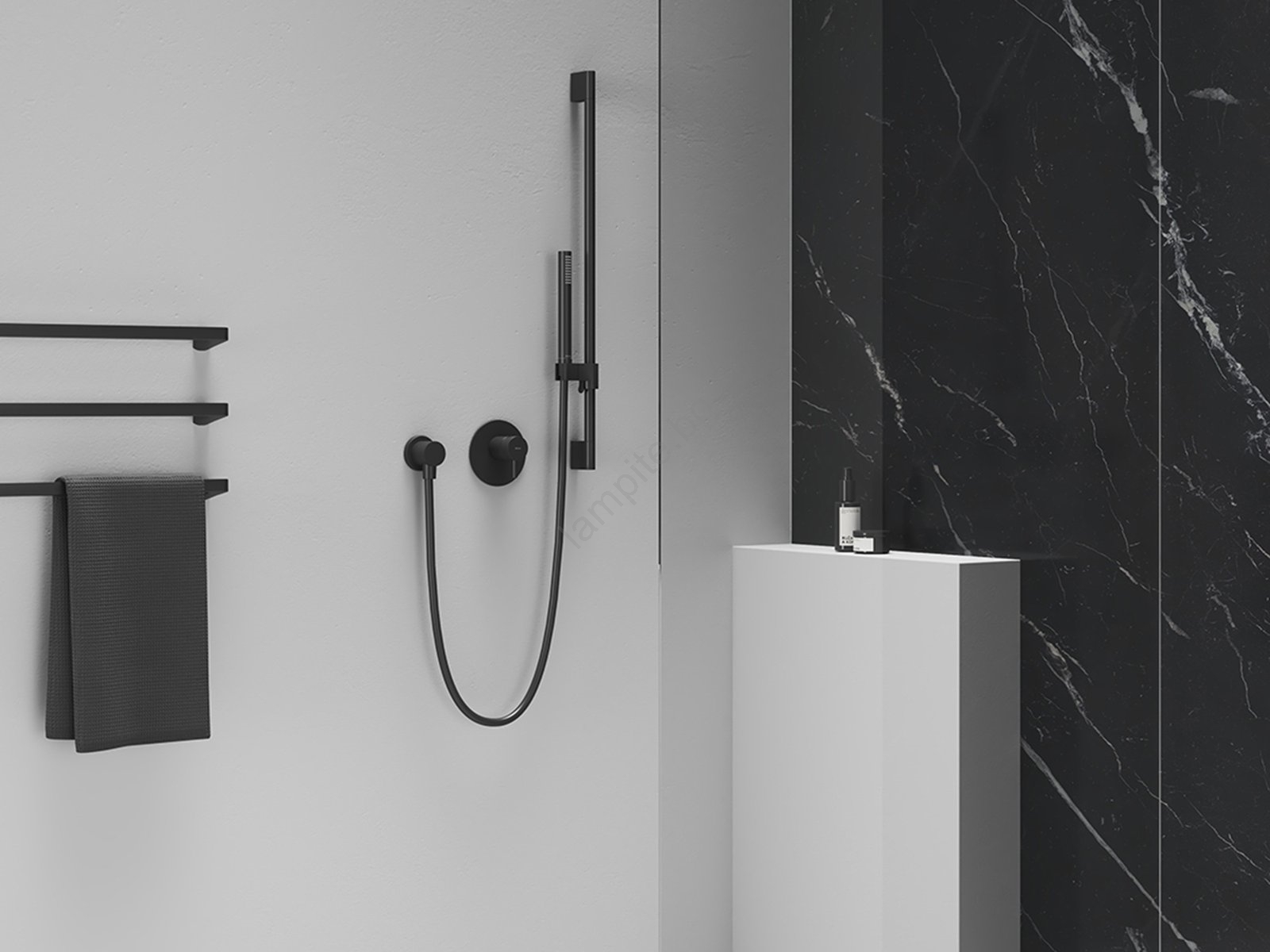 • Държачът за ръчен душ е изработен от издръжлив месинг и е с модерно матово черно покритие Black Matt.
