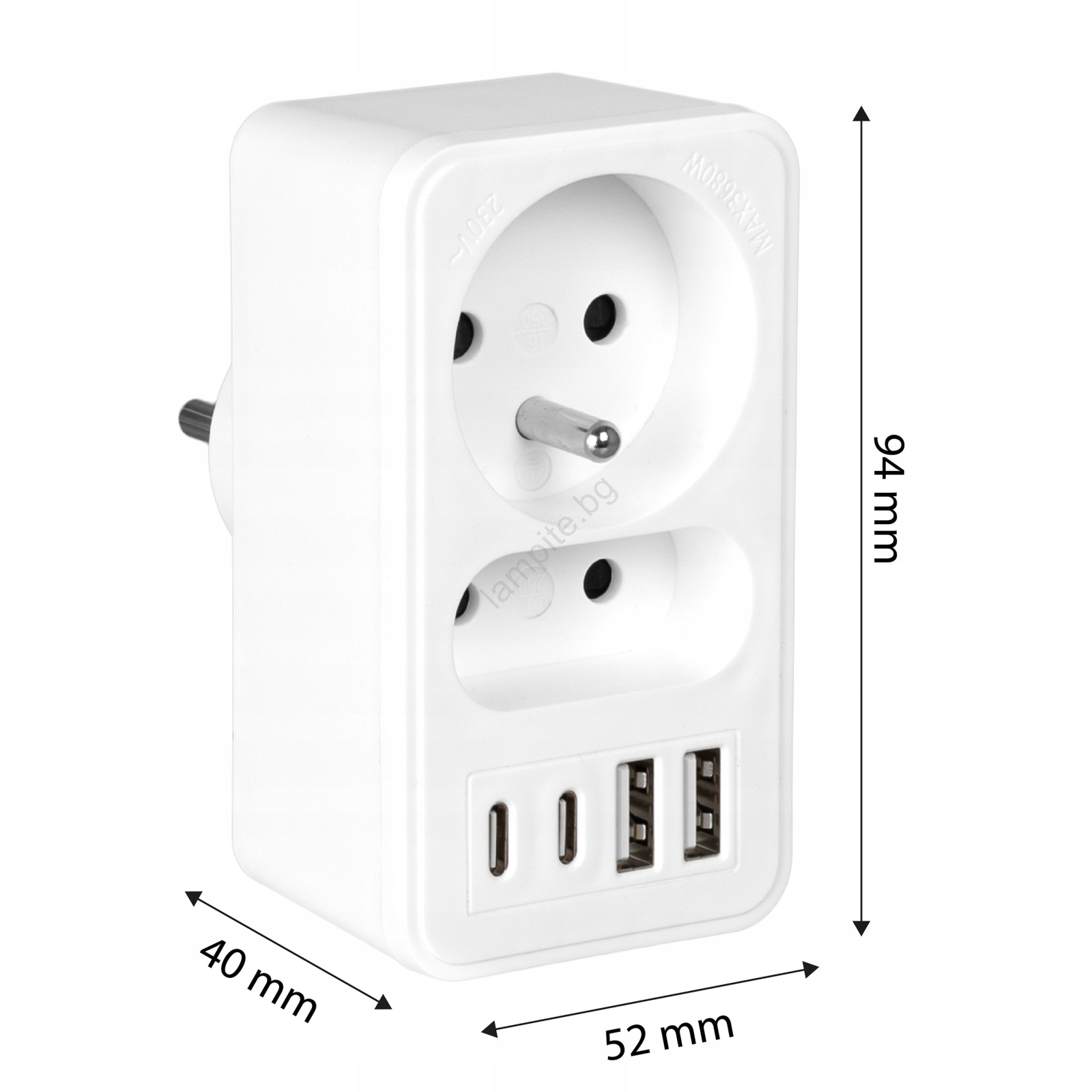 • Мрежов разклонител с 2 гнезда + 2× USB‑A + 2× USB‑C.