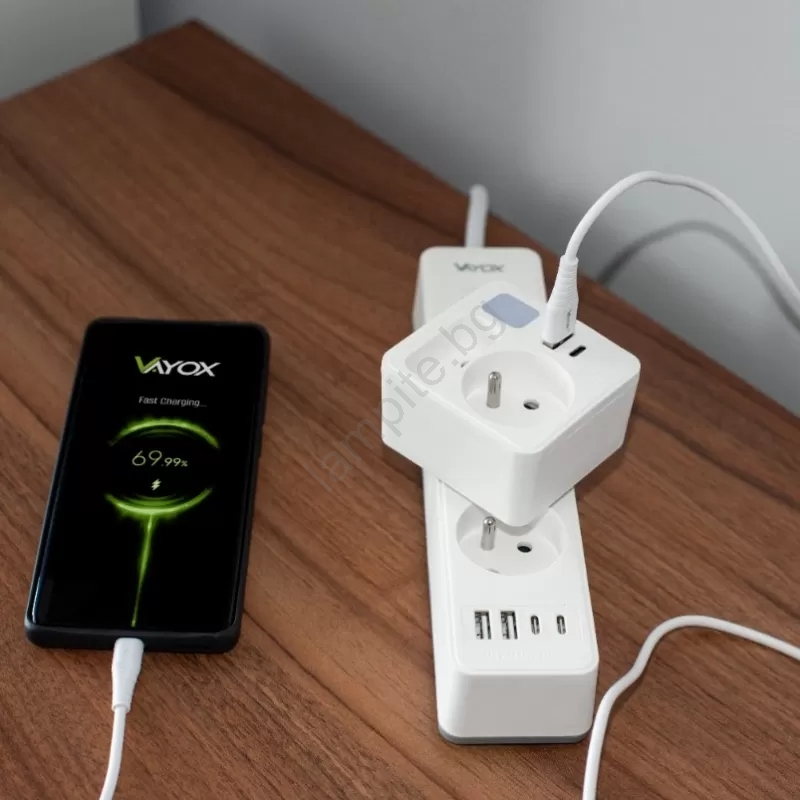 • Мултифункционално устройство 3 в 1: разклонител, зарядно устройство и нощна лампа.