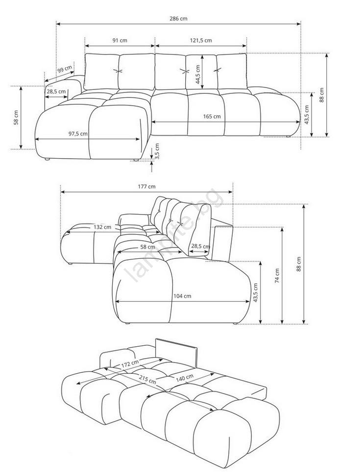 • Гърбът на дивана е облицован с качествена тапицерия, което позволява поставянето на дивана свободно в помещението.