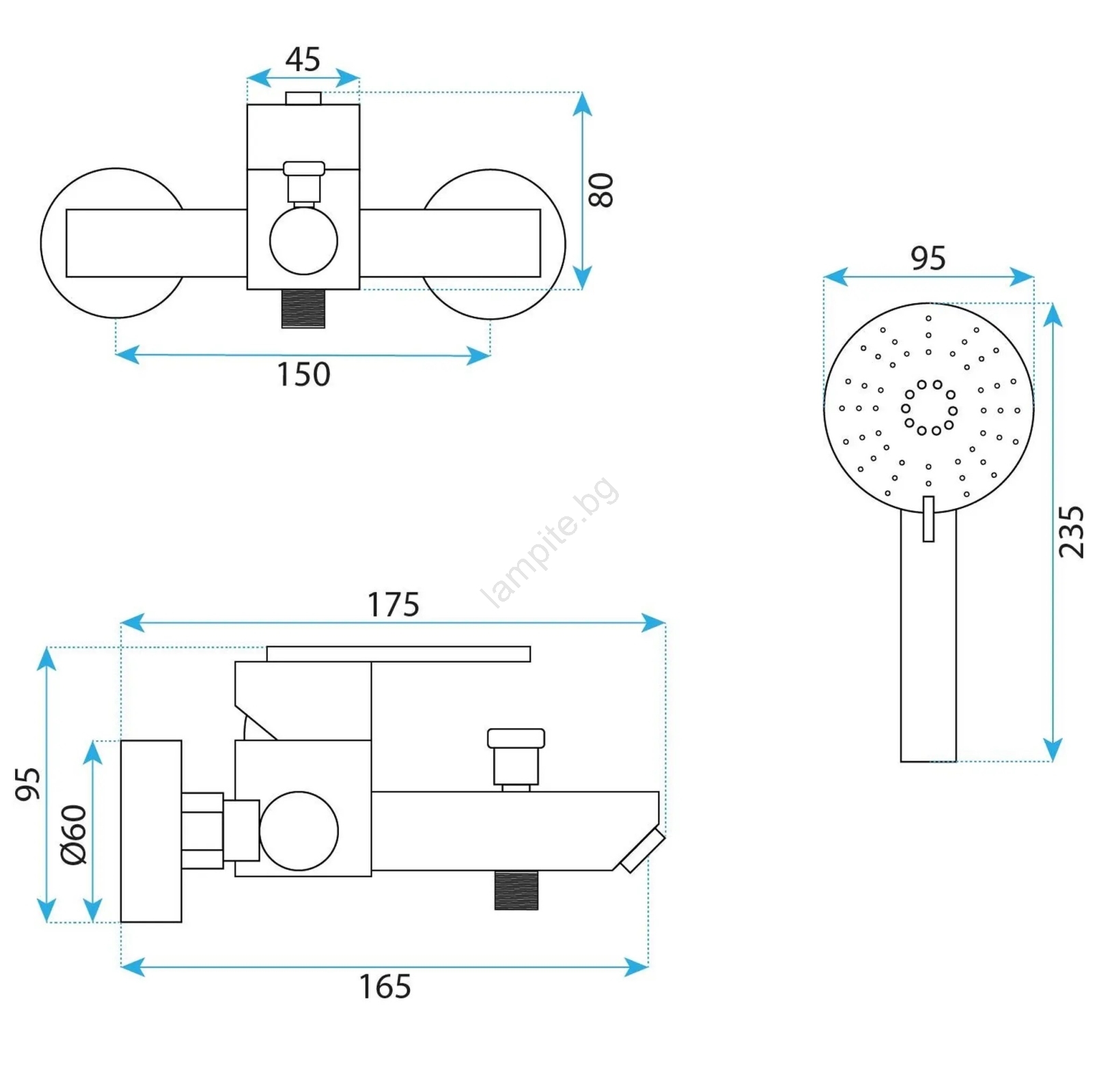 • Комплектът включва: смесител за вана, ръчен душ, душ маркуч, държач за ръчен душ.