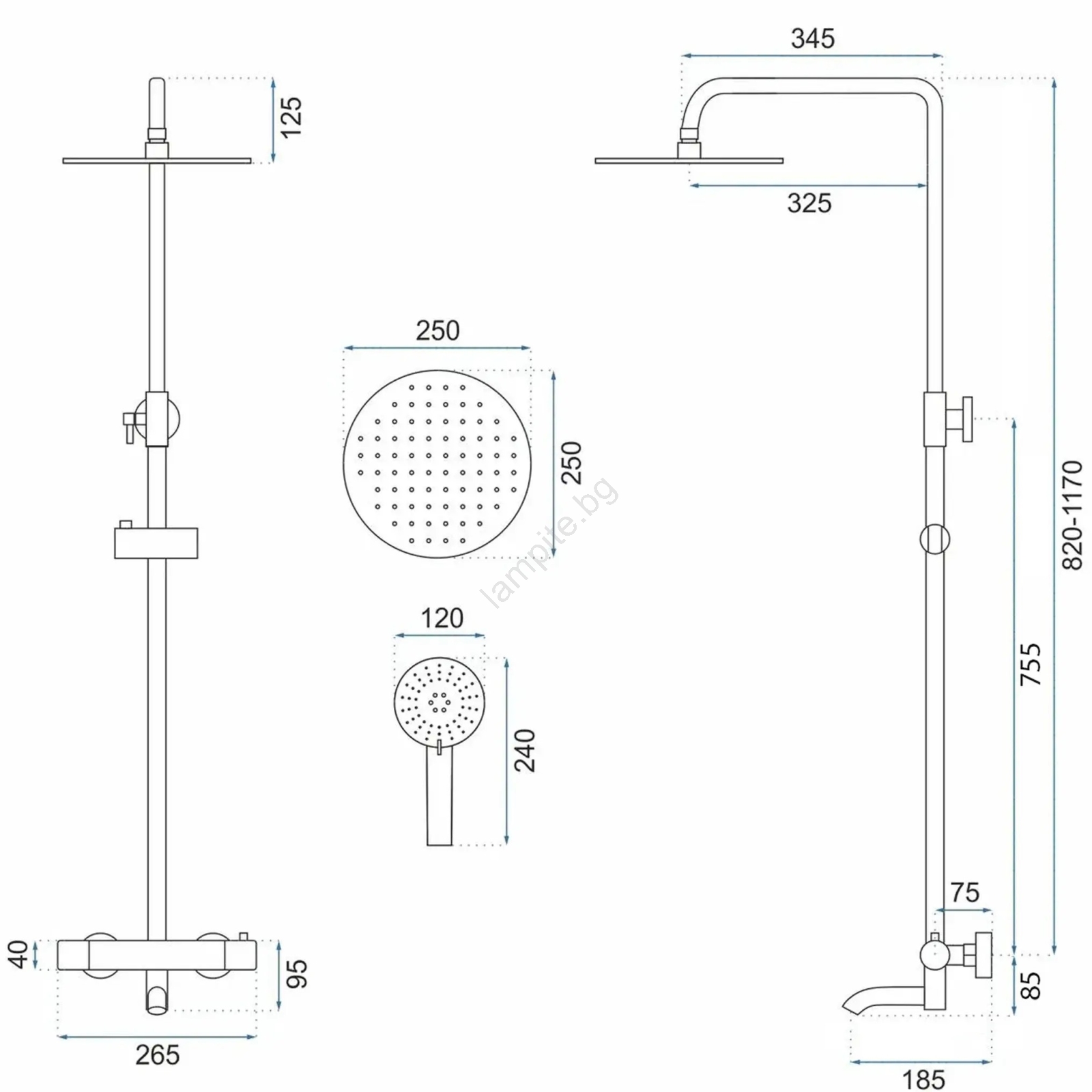 • Регулиране на душовата штанга: 82 - 117 cm.