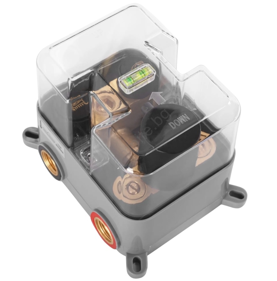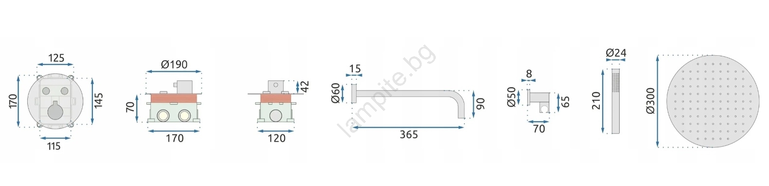 • Опаковката съдържа: вграден монтажен бокс, комплект смесител, рамо, ръчен и горен душ, държач за ръчен душ, маркуч 150 см.