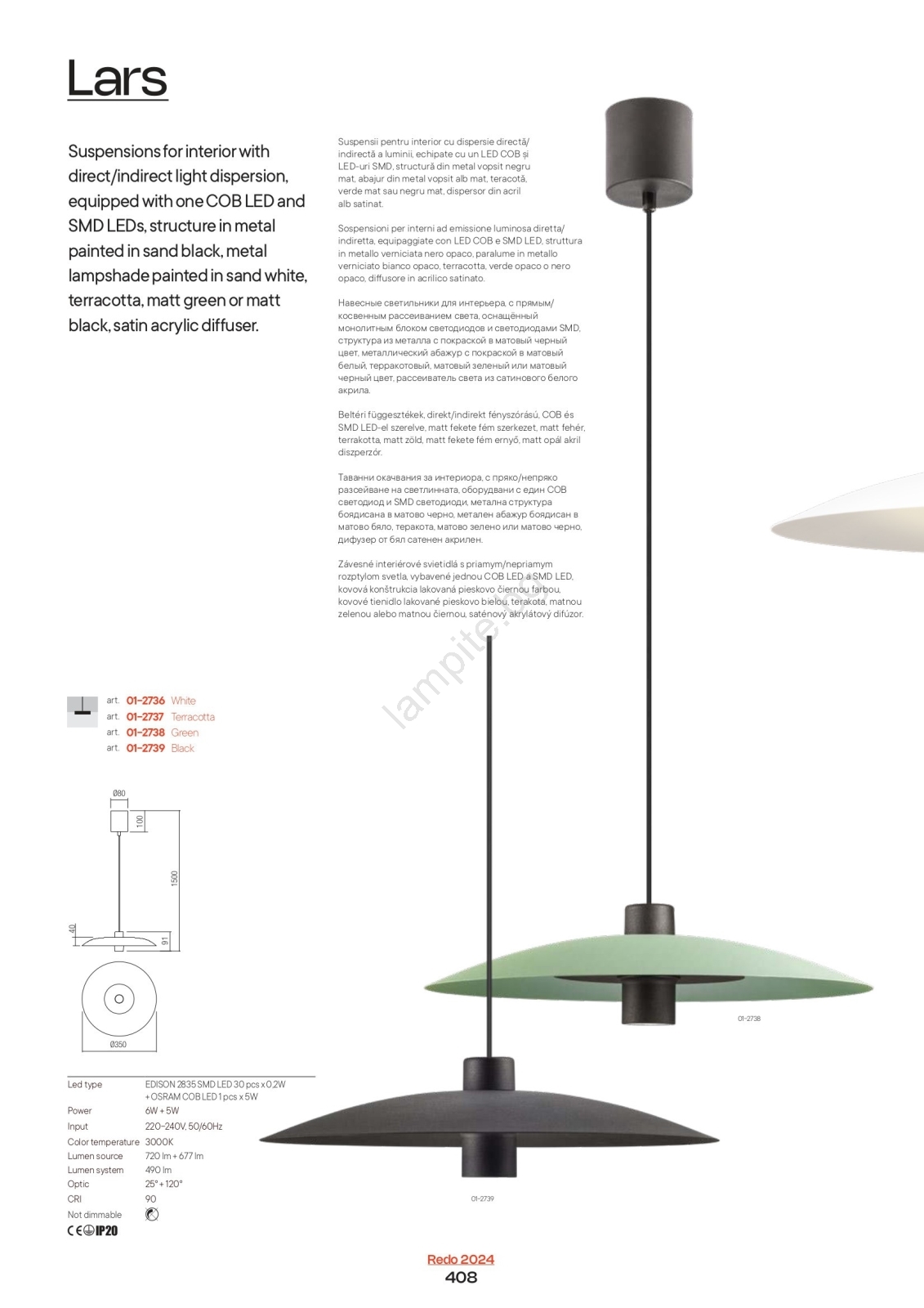 • Redo 01-3020 - LED полилей LARS на кабел, LED/14W/230V + LED/10W, диам. 60 см, CRI 90, оранжев