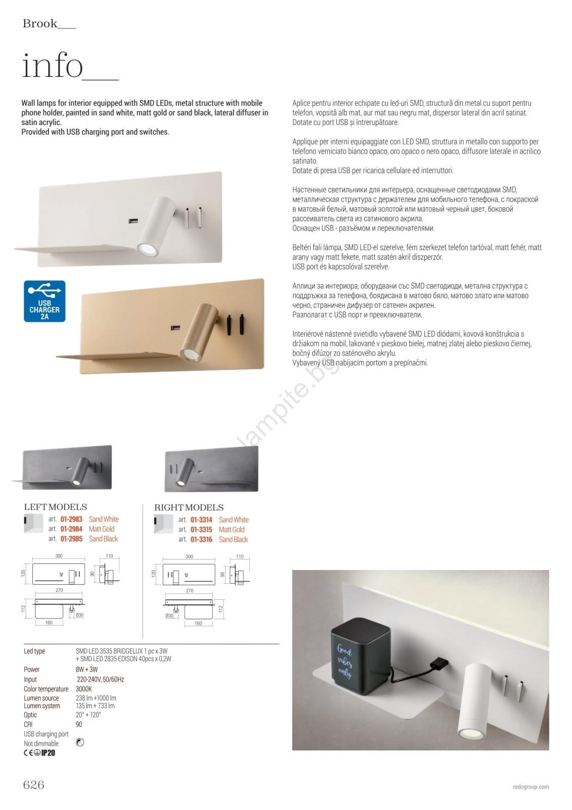 Redo 01-3316 - LED Стенен спот BROOK LED/8W/230V + LED/3W USB CRI 90 черен дeсен