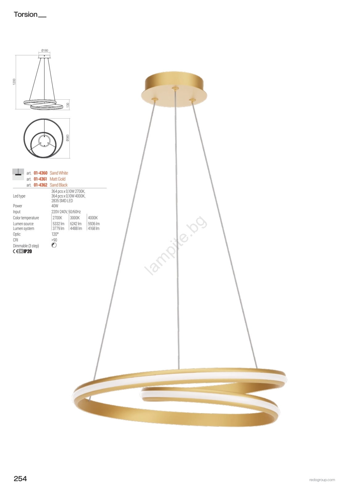 • Redo 01-4361 - Димируем полилей TORSION на кабел LED/40W/230V 2700/3000/4000K CRI 90 диам. 56 см златист