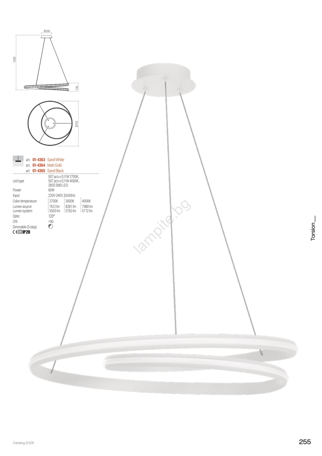 • Redo 01-4363 - LED димируем полилей на кабел TORSION LED/60W/230V 2700/3000/4000K CRI 90 pr. 75,2 cm бял