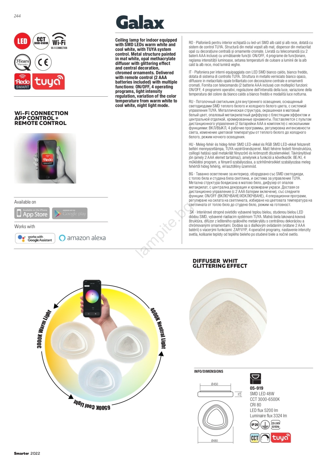 Redo 05-919 - Димируем плафон GALAX LED/48W/230V 3000–6500K Wi-Fi Tuya, Ø 48 см, бял + дистанционно управление