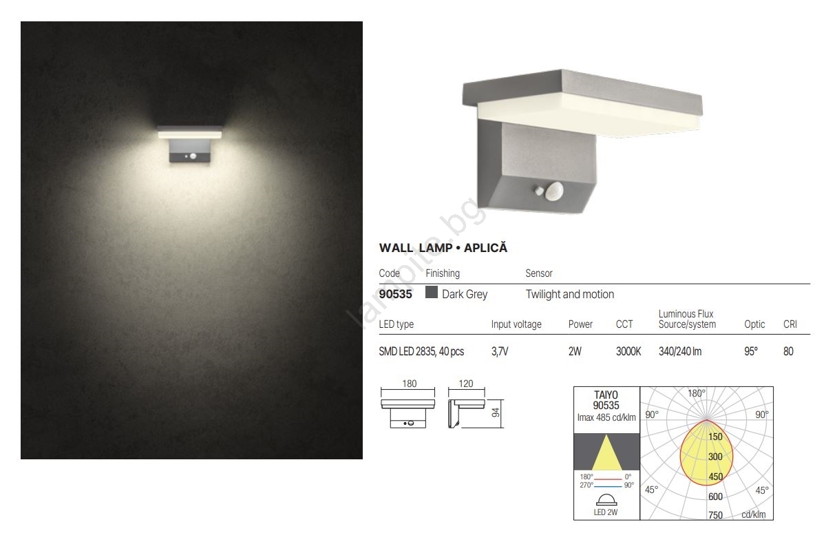 Redo 90535 - LED Соларен аплик със сензор TAIYO LED/2W/3,7V 3000K 2200 mAh IP54 антрацит