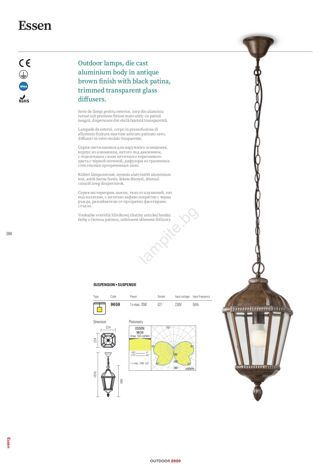 Redo 9656 - Външна стенна лампа ESSEN 1xE27/70W/230V IP44 кафява/патина се отличава с приятен и функционален дизайн.  Подходяща е крушка с цокъл E27. Тук можете да закупите и други крушки на изгодни цени. Ще имате интересно допълнение към дома си.