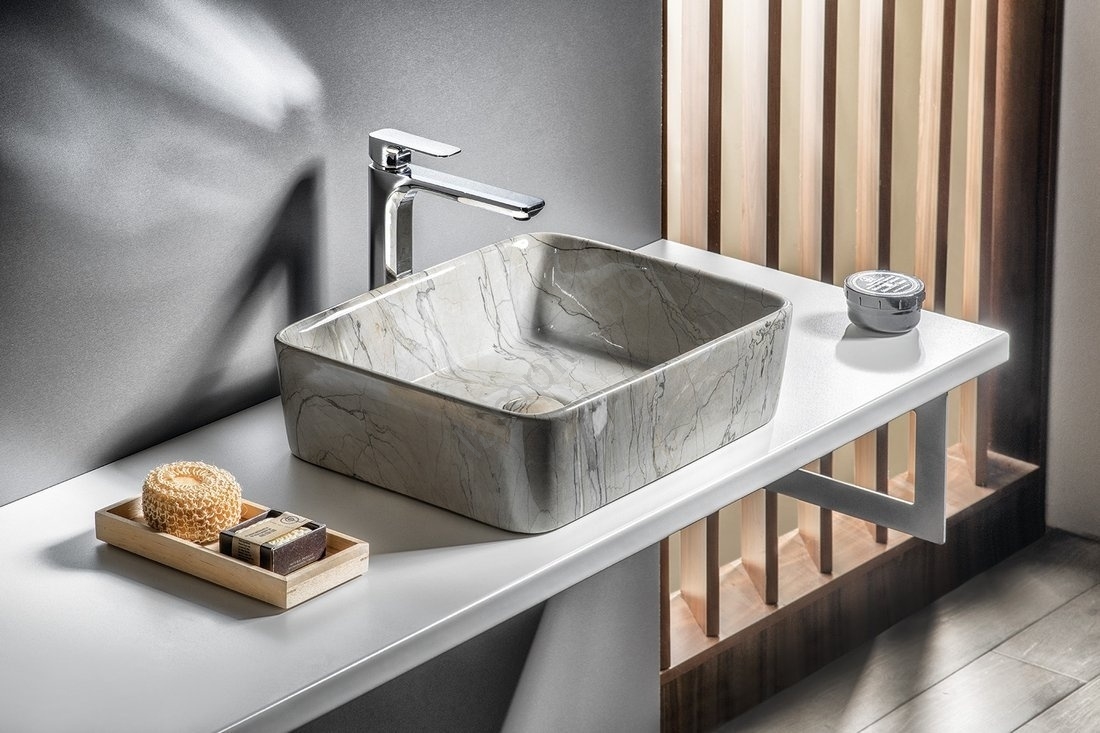 • Керамична мивка за поставяне върху плот с каменен ефект.